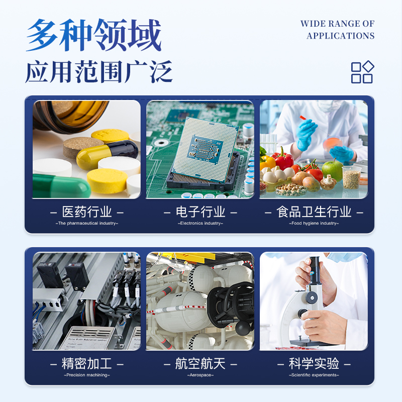 滿足醫(yī)藥行業(yè)(制藥廠、藥檢所、醫(yī)院手術(shù)室等);電子行業(yè)(半導體工廠、精密機械的生產(chǎn)加工等);食品衛(wèi)生行業(yè)(乳制品、塑封肉食品、調(diào)味食品、農(nóng)產(chǎn)品等的精加工);過濾器的生產(chǎn)廠家,檢驗過濾器的質(zhì)量及效率等;光學、及航空航天等領(lǐng)域的精加工、精密試驗所需的潔凈室(區(qū))的檢測需要。