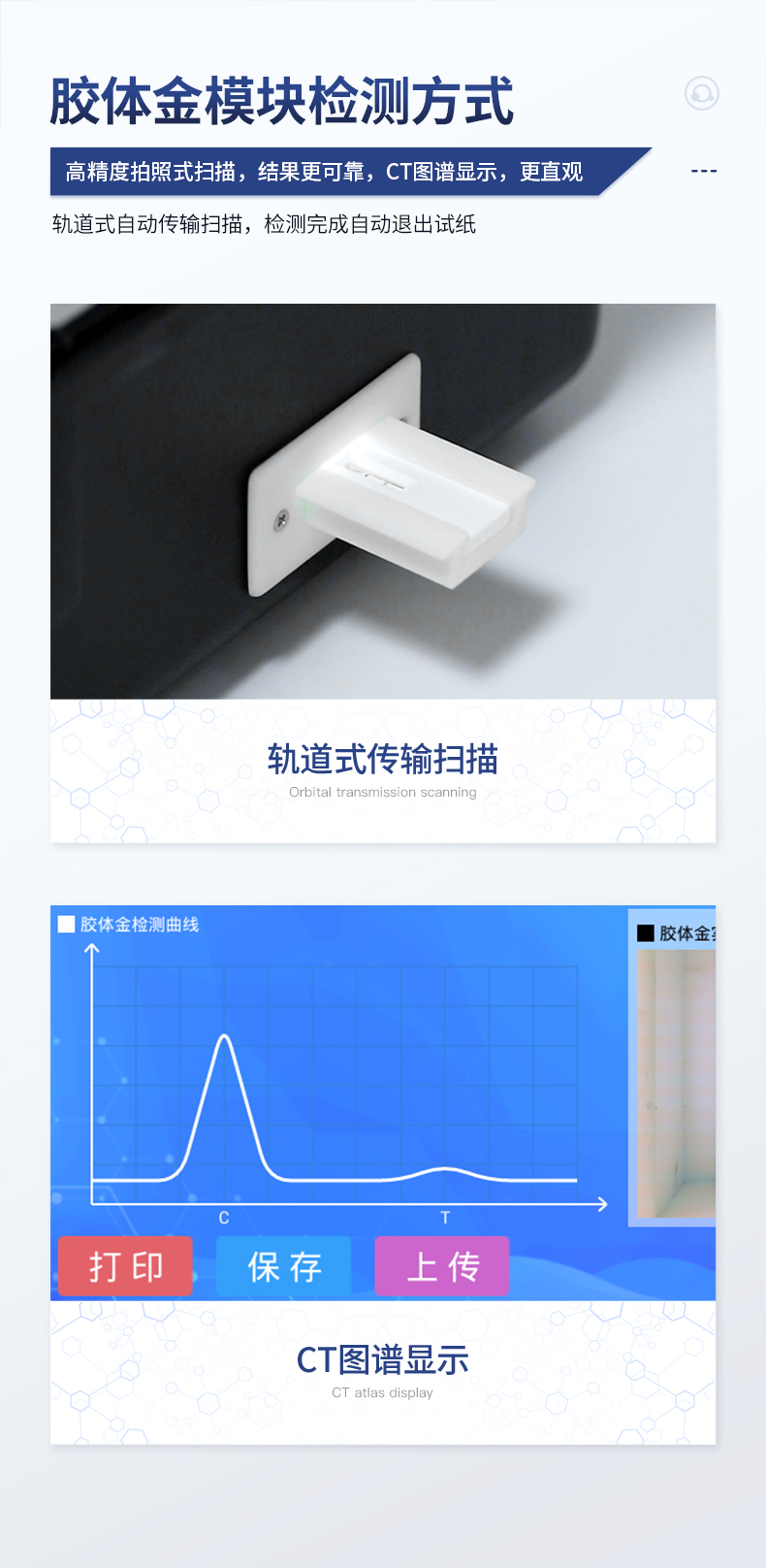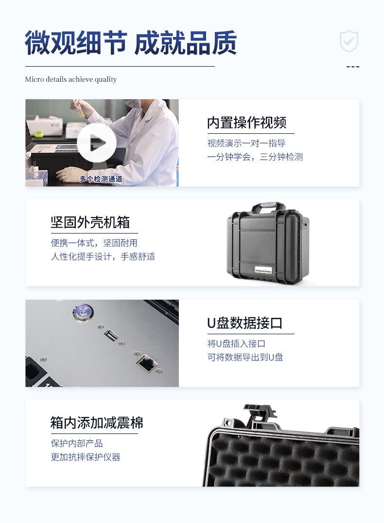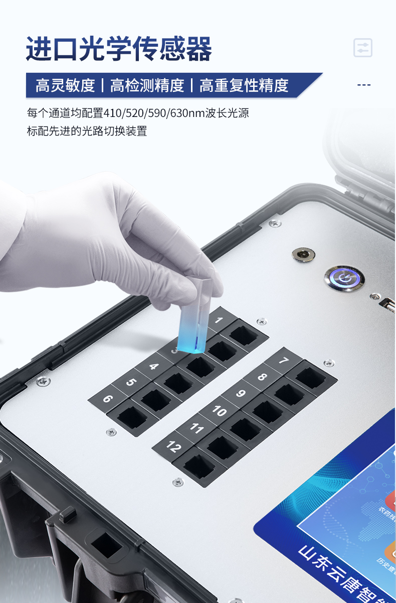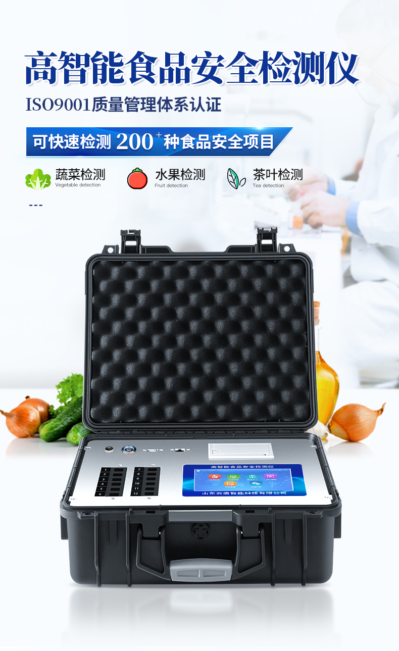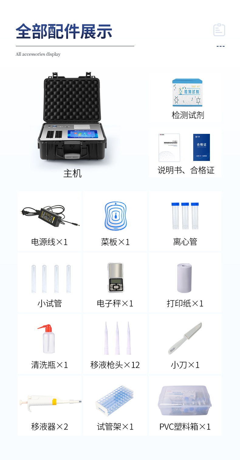 | ★安卓智能操作系統(tǒng),采用更加**UI交互界面,儀器具有wifi聯(lián)網(wǎng)上傳、4G聯(lián)網(wǎng)傳輸、GPRS無線遠傳、網(wǎng)線連接功能,快速批量上傳數(shù)據(jù)。 | 智能化程度高,儀器具有自檢功能:具有開機自檢和調(diào)零功能,具有自動檢測重復性功能。 | 一體化主機,包含食品安全檢測模塊、多通道農(nóng)藥殘留檢測模塊、膠體金免疫層析檢測模塊。 | 一體化便攜式快檢設備,滿足現(xiàn)場及流動檢測使用需求,能夠在同一軟件下實現(xiàn)所有檢測項目的檢測,并可通過同一窗口直觀顯示檢測結(jié)果。 | ★比色池帶有控溫功能,可以升降溫度,優(yōu)化了前處理過程,并且有效補償環(huán)境影響保證檢測結(jié)果 | ★儀器帶有監(jiān)管平臺,數(shù)據(jù)可局域網(wǎng)和互聯(lián)網(wǎng)數(shù)據(jù)上傳,檢測結(jié)果直接傳至食品安全監(jiān)管平臺。進行區(qū)域食品安全監(jiān)管及大數(shù)據(jù)分析處理與數(shù)據(jù)統(tǒng)計,檢測區(qū)域食品安全長短期動態(tài),達到食品安全問題預估、預警 | 膠體金檢測模塊,軌道式自動傳輸掃描,檢測完成后自動退出檢測卡。 | ★儀器內(nèi)置攝像頭拍照,可顯示金標卡實時圖像,系統(tǒng)自動分析并呈現(xiàn)出CT坐標曲線圖,CT線自動識別,無需手動調(diào)整。 | 內(nèi)置強大的數(shù)據(jù)庫,具有多品類多種類樣品菜單功能,可靈活選擇檢測樣品,不同的檢測通道可同時檢測不同的樣品項目。也可在儀器上直接編輯錄入樣品名稱、檢測指標、送檢單位等信息并保存進樣品數(shù)據(jù)庫。 | ★儀器內(nèi)置操作視頻,點擊視頻模塊即可快速學習,是您身邊的化驗指導專家。 | 樣品處理簡單省力,整體操作快速、安全、便捷。 | ★儀器可配置身份識別功能,通過密碼或刷證件開機,防止非工作人員操作等。 | 新一代高速熱敏打印機,檢測完成可自動打印或批量打印檢測報告和二維碼。 | 高靈敏度,高檢測精度,高重復性精度,掃描式高精度光學傳感器。 | 儀器具有重新校準、鎖定、恢復出廠設置功能。 | 結(jié)果判定線可修改,對照值標定值可保存,斷電不丟失數(shù)據(jù)。 | 兼容市場上所有的膠體金卡,使用耗材不受限制,極大增強用戶使用體驗。 |