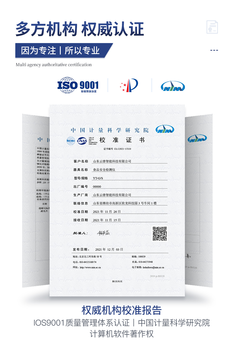 | ★廠家須有食品安全檢測知識產(chǎn)權(quán)管理體系認證證書 | ★廠家具有高新技術企業(yè)認證 | ★儀器具有食品安全轉(zhuǎn)件著作權(quán) | ★儀器具有國家級計量研究院出具的計量報告 | ★試劑具有國家級計量研究院出具的試劑測試報告 | ★具有ISO9001質(zhì)量管理體系認證 | ★具有環(huán)境管理體系認證 | ★具有職業(yè)健康安全管理體系認證 |