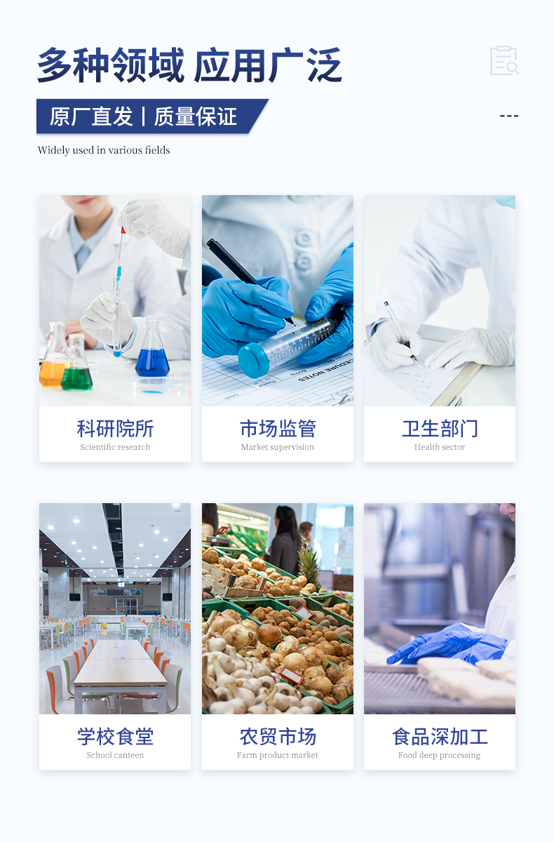 | 1、農(nóng) 殘: 檢出下限:抑制率 5% ,檢測范圍:抑制率(0~100)% | 2、甲 醛: 檢出下限:1mg/kg ,檢測范圍:(0~100) mg/kg | 3、亞硝酸鹽: 檢出下限:1mg/kg ,檢測范圍:(0~100) mg/kg | 4、二氧化硫: 檢出下限:1mg/kg;5mg/kg ,檢測范圍:(0~100) mg/kg;(0~500) mg/kg | 5、吊 白 塊: 檢出下限:5 mg/kg ,檢測范圍:(0~500) mg/kg | 6、蛋 白 質(zhì): 檢出下限:0.5% ,檢測范圍:(0~50)% | 7、硼 砂: 檢出下限:5 mg/kg ,檢測范圍:(0~100) mg/kg | 8、雙 氧 水: 檢出下限:5 mg/kg;10 mg/kg;100 mg/kg ,檢測范圍:(0~500) mg/kg; (0~1000) mg/kg;(0~10000) mg/kg | 9、硝 酸 鹽: 檢出下限:10 mg/kg;40 mg/kg ,檢測范圍:(0~1000) mg/kg; (0~4000) mg/kg | 10、重金屬鉛: 檢出下限:0.5 mg/kg;0.2 mg/L ,檢測范圍:(0~50) mg/kg;(0~20) mg/L |