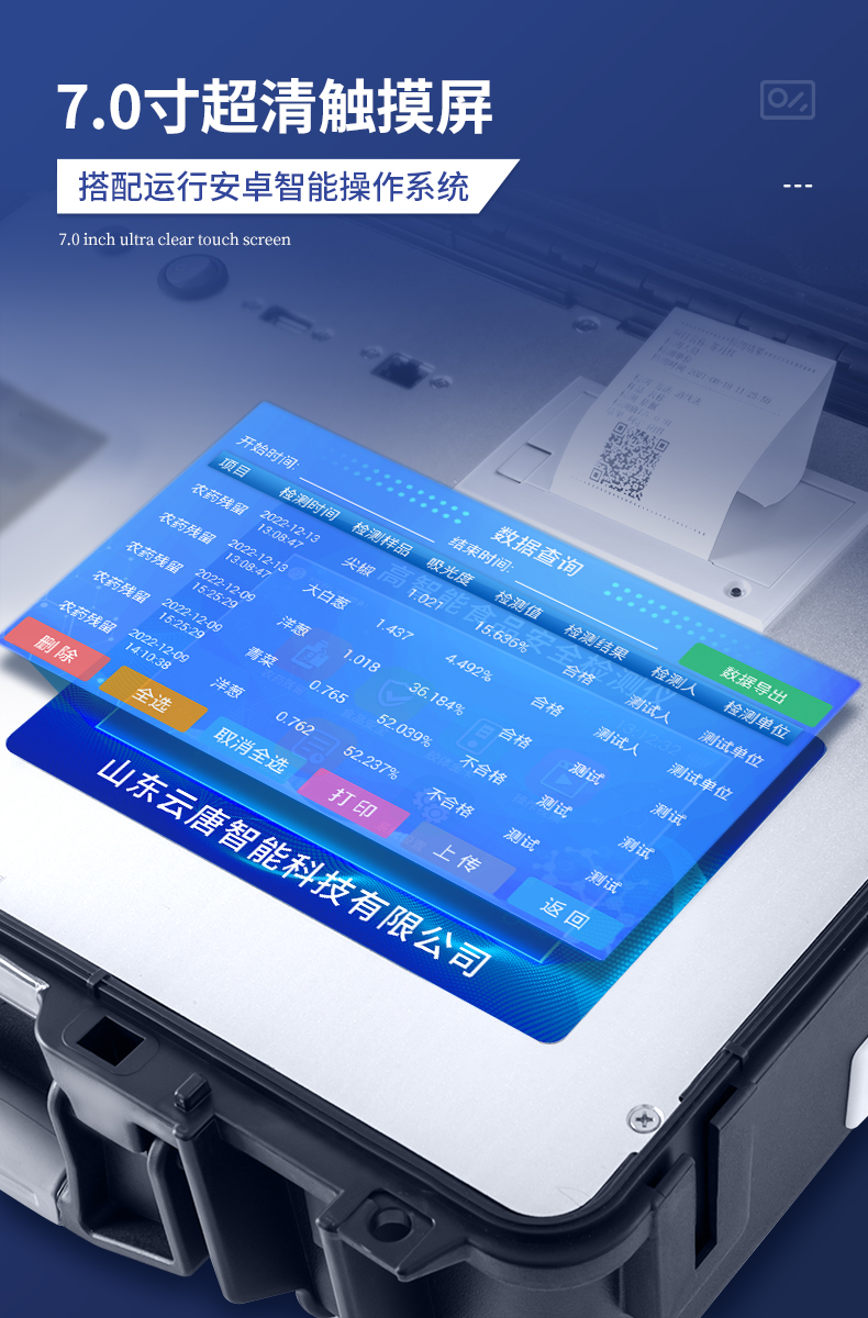 簡介:高精度食品安全檢測儀使用新一代高速熱敏打印機,檢測完成可自動打印或批量打印檢測報告和二維碼。