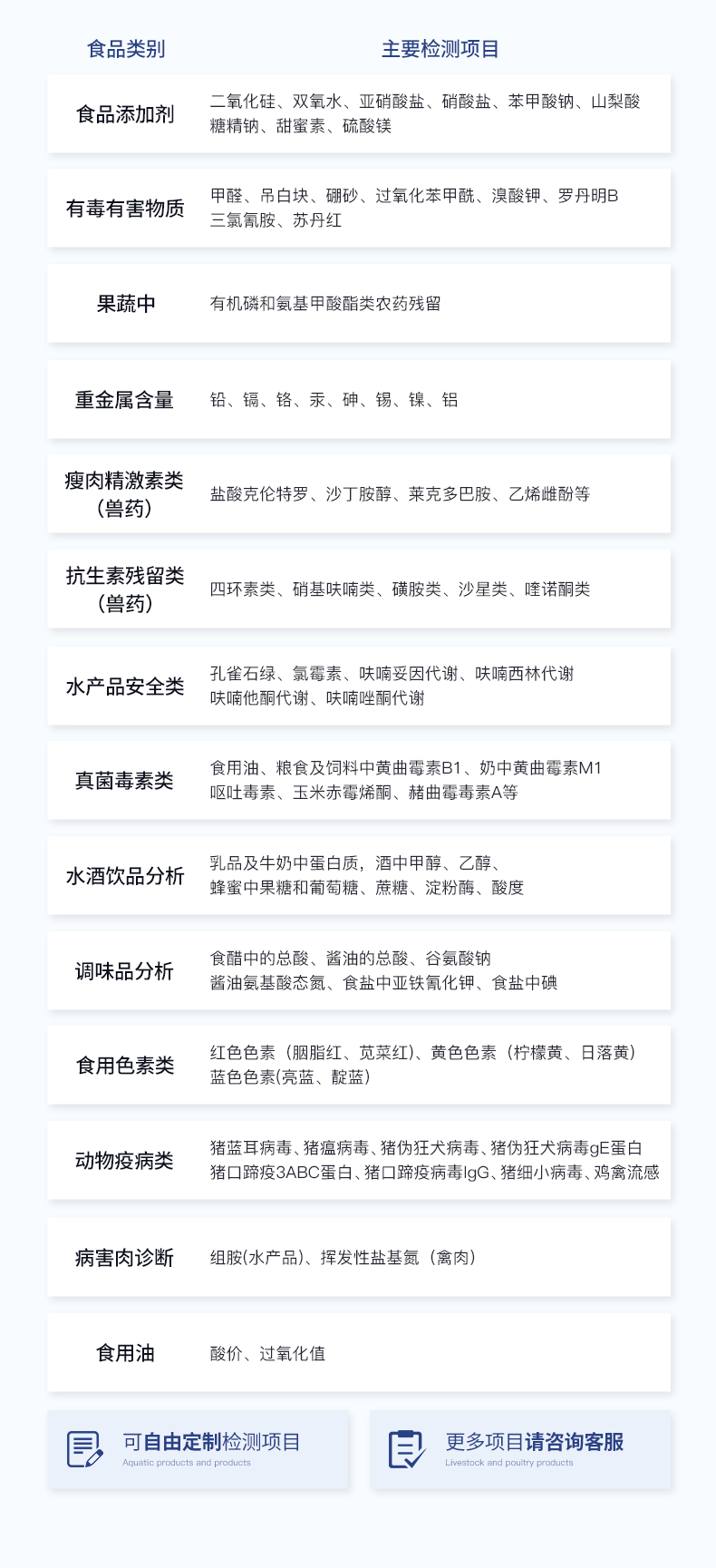 | 食品添加劑:二氧化硫、雙氧水、亞硝酸鹽、硝酸鹽、苯甲酸鈉、山梨酸、糖精鈉、甜蜜素、安賽蜜、硫酸鎂等 | 有毒有害物質(zhì):甲醛、吊白塊、硼砂、過氧化苯甲酰、溴酸鉀、羅丹明B、三聚氰胺、蘇丹紅等 | 農(nóng)藥殘留:酶抑制率法:有機磷氨基甲酸酯類農(nóng)藥;膠體金法:各種具體農(nóng)藥檢測 | 病害肉診斷:組胺、揮發(fā)性鹽基氮、肉制品酸價、水發(fā)產(chǎn)品中組胺 | 重金屬含量:鉛、鎘、鉻、汞、砷、錫、鎳、鋁等;食用油脂檢測:過氧化值、酸價、油脂丙二醛等。 | 食用油脂檢測:::過氧化值、酸價、油脂丙二醛、總多酚等。 | 瘦肉精激素類(獸藥):鹽酸克倫特羅、沙丁胺醇、萊克多巴胺、己烯雌酚、喹乙醇等 | 抗生素殘留類(獸藥):四環(huán)素類、硝基呋喃類、磺胺類、β-興奮劑類、沙星類、磺胺類、喹諾酮類,甲砜霉素,氟苯尼考,金剛烷胺、替米考星、慶大霉素、林可霉素、鏈霉素、恩諾沙星、環(huán)丙沙星、頭孢啦啶、青霉素、阿莫西林等 | 真菌毒素類:食用油、糧食及飼料中黃曲霉毒素B1、奶中黃曲霉毒素M1、嘔吐毒素、玉米赤霉烯酮、赭曲霉毒素A等 | 水酒飲品分析:乳品及牛奶中蛋白質(zhì);酒中甲醇、乙醇、雜醇油;蜂蜜中果糖和葡萄糖、蔗糖、淀粉酶、酸度;水中氰化物、余氯,飲料中維C等 | 調(diào)味品成分:食醋的總酸、醬油的總酸、芝麻油純度、谷氨酸鈉、醬油氨基酸態(tài)氮、食鹽中亞鐵氰化鉀、食鹽中碘等 | 食用色素類:紅色色素(胭脂紅、莧菜紅、赤蘚紅、誘惑紅)、黃色色素(檸檬黃、日落黃)、藍色色素(亮藍)等 | 動物疫病類:豬藍耳病毒、豬瘟病毒、豬偽狂犬病毒、豬偽狂犬病毒gE蛋白、豬口蹄疫3ABC蛋白、豬口蹄疫病毒IgG、豬細小病毒、雞禽流感等 | 水產(chǎn)品安全類:孔雀石綠、氯霉素、呋喃妥因代謝、呋喃西林代謝、呋喃它酮代謝、呋喃唑酮代謝、氟苯尼考、土霉素、金霉素、甲砜霉素、地西泮等 |