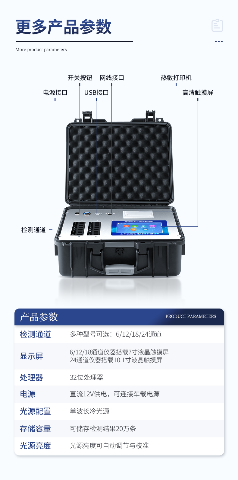 | 1、主控芯片采用ARM Cortex-A7,RK3288/4核處理器,主頻1.88Ghz,運轉(zhuǎn)速度更快速,穩(wěn)定性更強。 | 2、★顯示方式:10英寸液晶觸摸屏顯示,人性化中文操作界面,讀數(shù)直觀、簡單。 | 3、交直流兩用,直流12V供電,可連接車載電源,可配6ah大容量充電鋰電池,方便戶外流動測試。 | ★4、★四波長冷光源,24個檢測通道,每個通道均配置410、520、590、630nm波長光源,標配**的光路切換裝置,專業(yè)光路切換功能可實現(xiàn)*多64波長,并且所有檢測項目可實現(xiàn)所有通道同時檢測。 | 5、智能恒流穩(wěn)壓,光強自動調(diào)節(jié)與校準,長時間連續(xù)工作光源無溫漂現(xiàn)象。 | ★6、內(nèi)置新國家限量標準,與所測結(jié)果進行現(xiàn)場比對,并持續(xù)更新標準。 | 7、不間斷進樣,連續(xù)檢測 | 8、樣本編號自動累加。 | 9、檢測結(jié)果為Excel表格,連接電腦即可拷貝。 | 10、檢測結(jié)果存儲容量20萬條。 | ★11、同時支持U盤拷貝,標準USB接口,免驅(qū)動插拔。 | 12、檢測項目可擴充,固件可升級 | 13、儀器尺寸:43×35×19cm, 主機凈重:5.1kg | 14、儀器包裝尺寸:510*390*375mm 包裝重量:9.1kg |