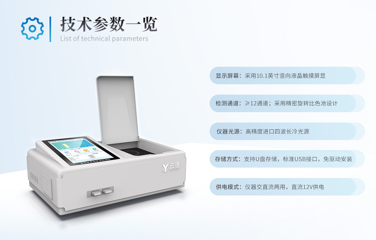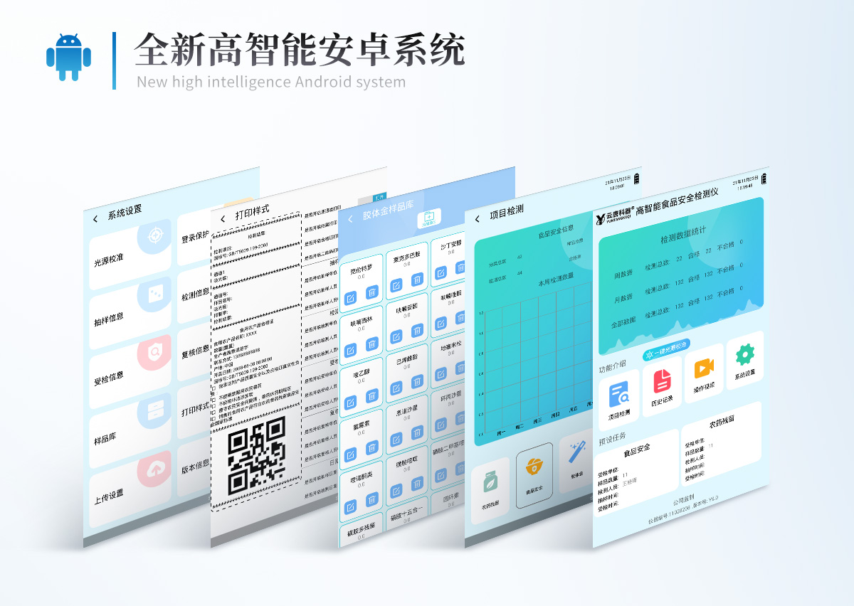 | 儀器采用手提式一體化系統(tǒng)檢測技術(shù),將分光光度模塊、數(shù)字化管理模塊、無線通訊模塊高度集成于一體,支持檢測200種食品安全檢測項(xiàng)目,同時(shí)預(yù)留升級(jí)檢測方法。 | 儀器檢測模塊標(biāo)準(zhǔn)化、智能化,檢測項(xiàng)目可隨意自由組合。檢測箱體內(nèi)置多個(gè)標(biāo)準(zhǔn)檢測單元,檢測模塊可以調(diào)整配置。 | 顯示屏幕:儀器采用10.1英寸豎向液晶觸摸屏顯,搭配運(yùn)行安卓智能操作系統(tǒng),主控芯片采用ARM Cortex-A7,RK3288/4核處理器,主頻1.88Ghz,操作方便,性能更強(qiáng)。 | 檢測通道:≥12通道;采用精密旋轉(zhuǎn)比色池設(shè)計(jì),使用同芯片同光源校準(zhǔn)精度,解決不同光源之間的誤差值,更加準(zhǔn)確**。(1-12通道間誤差0.1%,**號(hào):**202022821055.2) | 儀器光源:高精度進(jìn)口四波長冷光源,每個(gè)通道均配置 410、520、590、630nm 波長光源,標(biāo)配**的光路切換裝置,**光路切換功能可實(shí)現(xiàn)64波長,并且所有檢測項(xiàng)目可實(shí)現(xiàn)所有通道同時(shí)檢測。 | 設(shè)備可一鍵校準(zhǔn),自動(dòng)保存校準(zhǔn)數(shù)據(jù),自動(dòng)對(duì)比校驗(yàn),得到精準(zhǔn)光源,采用Android SP存儲(chǔ)數(shù)據(jù),光源數(shù)據(jù)永不丟失,方便每一次使用。 | 通訊接口:配備無線通信模塊、4G(APN)通訊模塊、藍(lán)牙傳輸,同時(shí)具有雙USB接口以及RJ45網(wǎng)線接口,可以多方式實(shí)現(xiàn)數(shù)據(jù)保存及數(shù)據(jù)傳輸。 | 存儲(chǔ)方式:支持U盤存儲(chǔ),標(biāo)準(zhǔn)USB接口,免驅(qū)動(dòng)安裝。檢測結(jié)果存儲(chǔ)容量20萬條以上,可生成Excel表格進(jìn)行拷貝,并具有登錄保護(hù)功能。 | 智能化操作系統(tǒng): | 1)操作系統(tǒng):儀器可在同一檢測界面自動(dòng)對(duì)應(yīng)相關(guān)檢測通道,一次性選擇1-12個(gè)樣品名稱,無需退出界面,節(jié)省操作時(shí)間。并可以對(duì)每個(gè)通道屬性和樣品信息單獨(dú)進(jìn)行編輯,例如送檢單位、人員,檢測人員等,打印時(shí)勾選打印顯示。 | 2)數(shù)據(jù)集成系統(tǒng):設(shè)備首頁自動(dòng)匯總分析檢測數(shù)據(jù),包含:周檢測數(shù)據(jù)、月檢測數(shù)據(jù),全部檢測總數(shù)量,均包含檢測總數(shù),合格數(shù),不合格數(shù),以及相關(guān)柱形分析圖,各項(xiàng)檢測數(shù)據(jù)一目了然,無需電腦查詢,更加快捷直觀。 | 3)數(shù)據(jù)庫系統(tǒng):十幾項(xiàng)數(shù)據(jù)庫分類管理儀器:包含項(xiàng)目類型、項(xiàng)目數(shù)據(jù)、檢測數(shù)據(jù)、歷史記錄、國標(biāo)信息、曲線信息、采樣信息、檢測信息、受檢信息、復(fù)核信息、圖表信息、光源校準(zhǔn)信息、打印樣式信息、樣品庫信息等等,數(shù)據(jù)庫之間互相協(xié)調(diào)聯(lián)動(dòng)保證數(shù)據(jù)的真實(shí)完整性。同時(shí)產(chǎn)品數(shù)據(jù)庫以及歷史檢測記錄支持一鍵檢索功能。 | 4)限量規(guī)判系統(tǒng):具有限量查詢、添加物質(zhì)合規(guī)判定系統(tǒng)。檢測出結(jié)果后,系統(tǒng)自動(dòng)調(diào)用系統(tǒng)數(shù)據(jù)庫中相關(guān)國標(biāo)進(jìn)行比對(duì)判定,客觀顯示判定結(jié)果是否合格。 | 5)項(xiàng)目預(yù)設(shè)系統(tǒng):儀器具有任務(wù)預(yù)設(shè)模塊,一鍵提前預(yù)設(shè),給出方便快捷的新檢測方案,每一個(gè)任務(wù)分別可以設(shè)置不同的樣品、批次、編號(hào)、來源、備注、抽樣信息、檢測信息、受檢信息、復(fù)核信息等更多信息。樣品送檢時(shí)一鍵調(diào)取保存信息,并可多次調(diào)取,大大提高檢測效率。 | 6)數(shù)據(jù)監(jiān)管系統(tǒng):同步對(duì)接監(jiān)管平臺(tái),數(shù)據(jù)可局域網(wǎng)和互聯(lián)網(wǎng)數(shù)據(jù)上傳,檢測結(jié)果可選擇直接傳至食品安全監(jiān)管平臺(tái)。進(jìn)行區(qū)域食品安全監(jiān)管及大數(shù)據(jù)分析處理與數(shù)據(jù)統(tǒng)計(jì),檢測區(qū)域食品安全長短期動(dòng)態(tài),達(dá)到食品安全問題預(yù)估、預(yù)警。 | 7)打印系統(tǒng):內(nèi)置全新打印機(jī),新創(chuàng)自定義打印方式,可按需靈活勾選控制:產(chǎn)品合格證(國家農(nóng)業(yè)部標(biāo)準(zhǔn)要求),二維碼,抽樣信息、檢測信息,受檢信息、復(fù)核信息、抽樣日期、檢測日期等信息的打印。 | 供電模式:儀器交直流兩用,直流12V供電,可連接車載電源,可配6ah大容量充電鋰電池,電量可實(shí)時(shí)顯示,方便戶外流動(dòng)測試。 | 儀器加入遠(yuǎn)程升級(jí)功能,可定向分客戶分儀器更新,開機(jī)后自動(dòng)更新,客戶無需任何操作,即可升級(jí)全新項(xiàng)目。做到了無需退換機(jī)器即可實(shí)現(xiàn)實(shí)時(shí)遠(yuǎn)程升級(jí)檢測儀器。 |