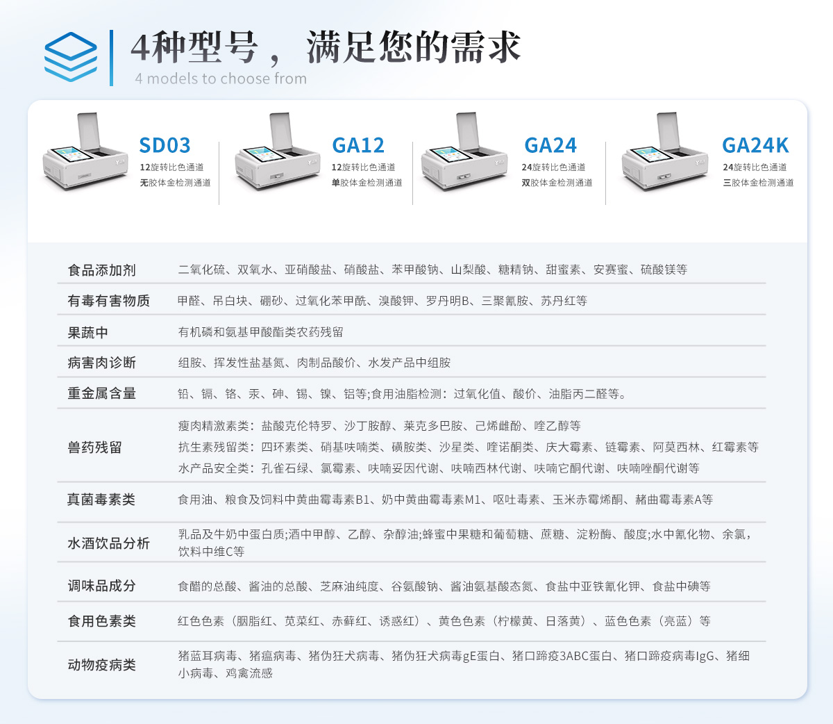 | 食品添加劑:二氧化硫、雙氧水、亞硝酸鹽、硝酸鹽、苯甲酸鈉、山梨酸鉀、糖精鈉、甜蜜素、木耳硫酸鎂等 | 有毒有害物質(zhì):甲醛、吊白塊、硼砂、過氧化苯甲酰、溴酸鉀、羅丹明B、三聚氰胺、蘇丹紅、工業(yè)堿、尿素、明礬等 | 食用油脂:過氧化值、酸價(jià)等 | 果蔬:農(nóng)藥殘留(酶抑制率法) | 病害肉:組胺、揮發(fā)性鹽基氮 | 重金屬含量:鉛、鎘、鉻、汞、砷、錫、鎳、鋁等 | 水酒飲品分析:酒中甲醇、乙醇、乳品及牛奶中蛋白質(zhì), | 蜂蜜成分:果糖和葡萄糖、蔗糖、淀粉酶、酸度等 | 調(diào)味品成分:食醋的總酸、醬油的總酸、芝麻油純度、谷氨酸鈉、醬油氨基酸態(tài)氮、食鹽中亞鐵氰化鉀、食鹽中碘等 | 食用色素類:紅色色素(胭脂紅、莧菜紅、莧菜紅)、黃色色素(檸檬黃、日落黃)、藍(lán)色色素(亮藍(lán))等 |