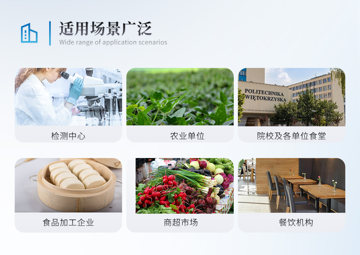 | 食品添加劑:二氧化硫、雙氧水、亞硝酸鹽、硝酸鹽、苯甲酸鈉、山梨酸鉀、糖精鈉、甜蜜素、木耳硫酸鎂等 | 有毒有害物質(zhì):甲醛、吊白塊、硼砂、過氧化苯甲酰、溴酸鉀、羅丹明B、三聚氰胺、蘇丹紅、工業(yè)堿、尿素、明礬等 | 食用油脂:過氧化值、酸價等 | 果蔬:農(nóng)藥殘留(酶抑制率法) | 病害肉:組胺、揮發(fā)性鹽基氮 | 重金屬含量:鉛、鎘、鉻、汞、砷、錫、鎳、鋁等 | 水酒飲品分析:酒中甲醇、乙醇、乳品及牛奶中蛋白質(zhì), | 蜂蜜成分:果糖和葡萄糖、蔗糖、淀粉酶、酸度等 | 調(diào)味品成分:食醋的總酸、醬油的總酸、芝麻油純度、谷氨酸鈉、醬油氨基酸態(tài)氮、食鹽中亞鐵氰化鉀、食鹽中碘等 | 食用色素類:紅色色素(胭脂紅、莧菜紅、莧菜紅)、黃色色素(檸檬黃、日落黃)、藍(lán)色色素(亮藍(lán))等 |