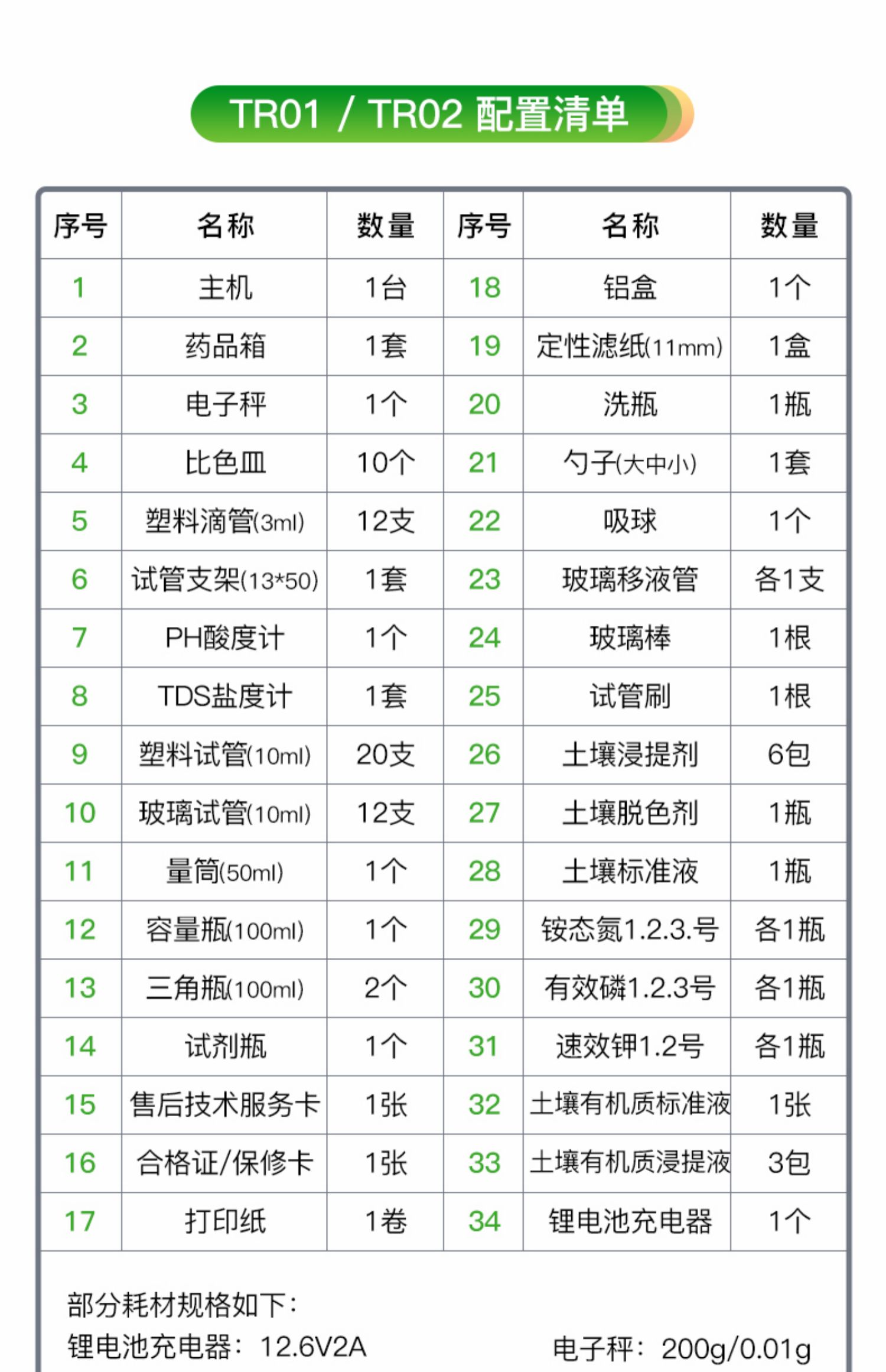配套齊全:該儀器集藥、器、儀為一體,攜帶方便,相當(dāng)于一個(gè)小型實(shí)驗(yàn)室。適于農(nóng)業(yè)服務(wù)部門或農(nóng)資經(jīng)銷商、肥料廠商測土施肥和鑒別肥料真假。