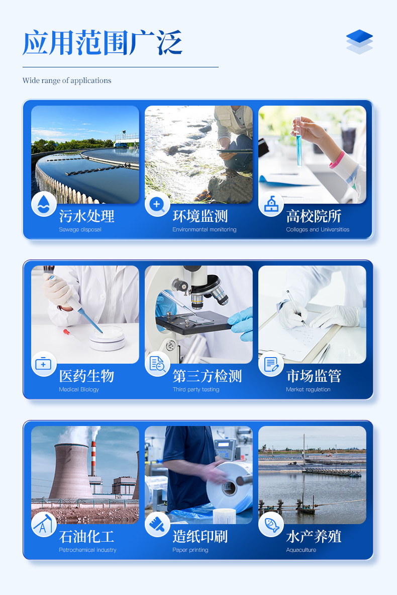 能夠廣泛的應用于各種行業(yè)(工業(yè)廢水、城市污水、生活污水及江湖流域地表水)廢水的檢測,可適合不同用戶的多種需求,可在化工、石油、焦化、造紙、冶金、釀造、醫(yī)藥等工業(yè)廢水及各種生活污水監(jiān)測應用。