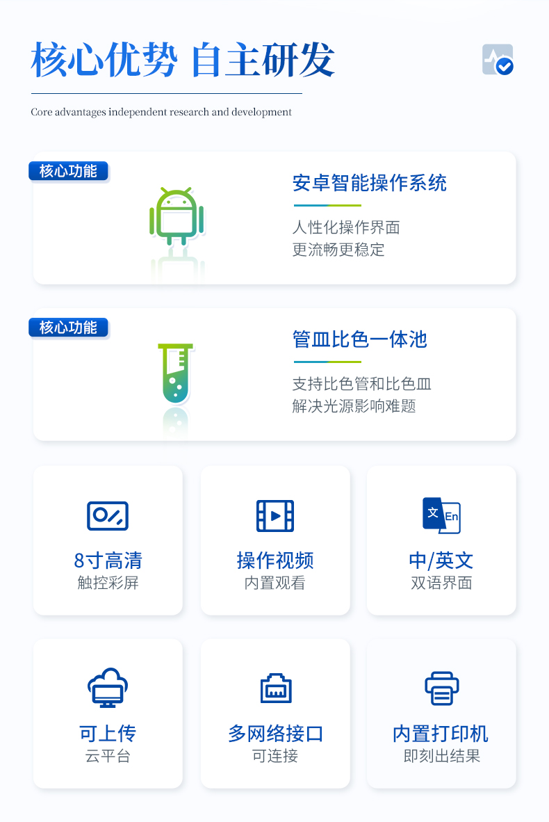 3、采用精密比色池設計,使用光源一致,可以解決由于光源誤差帶來的檢測結果誤差問題,檢測結果更加精準。