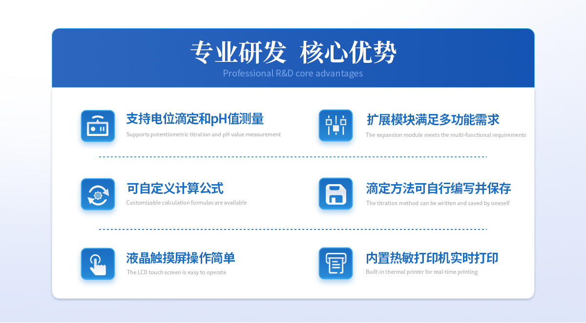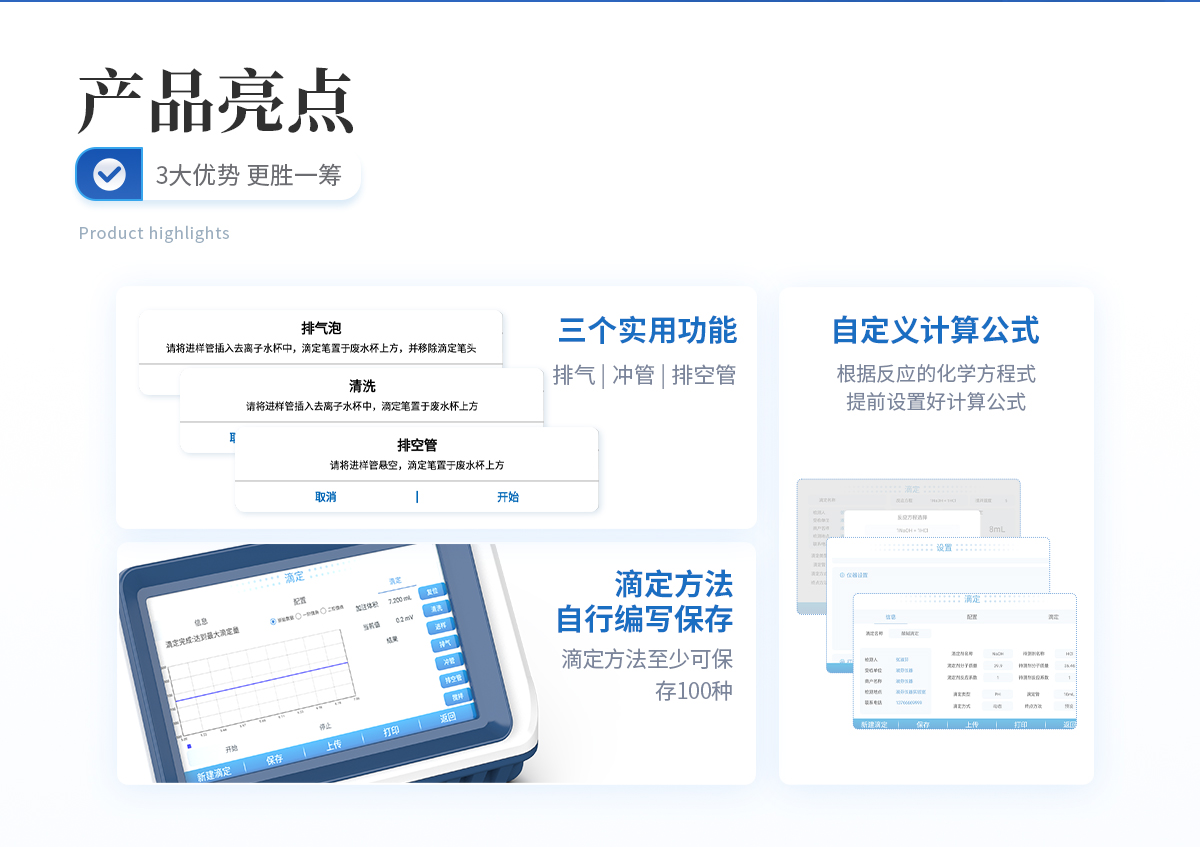 | 1、設(shè)備支持電位滴定和pH值測量;用戶選擇不同電極可進行酸堿滴定、氧化還原滴定、沉淀滴定、絡(luò)合滴定等多種滴定和pH測量; | 2、用戶可選配電導(dǎo)滴定、永停滴定等擴展模塊,滿足用戶多功能需求; | 3、設(shè)備對國家標(biāo)準(zhǔn)中采用的電位滴定法均滿足,用戶可根據(jù)檢測需求選擇適配的電極即可; | 4、支持動態(tài)滴定、等量滴定、手動滴定的滴定方式,可預(yù)設(shè)滴定終點或自動識別終點滴定,方便用戶根據(jù)樣品特性選擇**滴定工作流程; | 5、可自定義計算公式,根據(jù)反應(yīng)的化學(xué)方程式提前設(shè)置好計算公式,滴定完成后將自動獲得待測物含量; | 6、滴定方法可自行編寫并保存,形成滴定方法快捷模式,在使用時可直接選擇運行,滴定方法至少可保存100種; | 7、設(shè)備可作為實驗室常規(guī)手動滴定的滴定裝置使用;計量泵替代滴定管,磁力攪拌功能替代手動搖晃錐形瓶的工作; | 8、儀器實用的三個功能: (1)排氣,可將滴定管或管路內(nèi)的氣泡排出,避免氣泡帶來的滴定誤差; (2)沖管,可以*少的試劑消耗量使管路內(nèi)充滿試劑,實現(xiàn)節(jié)省試劑的同時減少試劑混合引入的滴定誤差; (3)排空管,可在實驗完成后將管路中的液體收集到滴定管內(nèi),避免在拆卸管路時產(chǎn)生藥液濺灑問題。 |