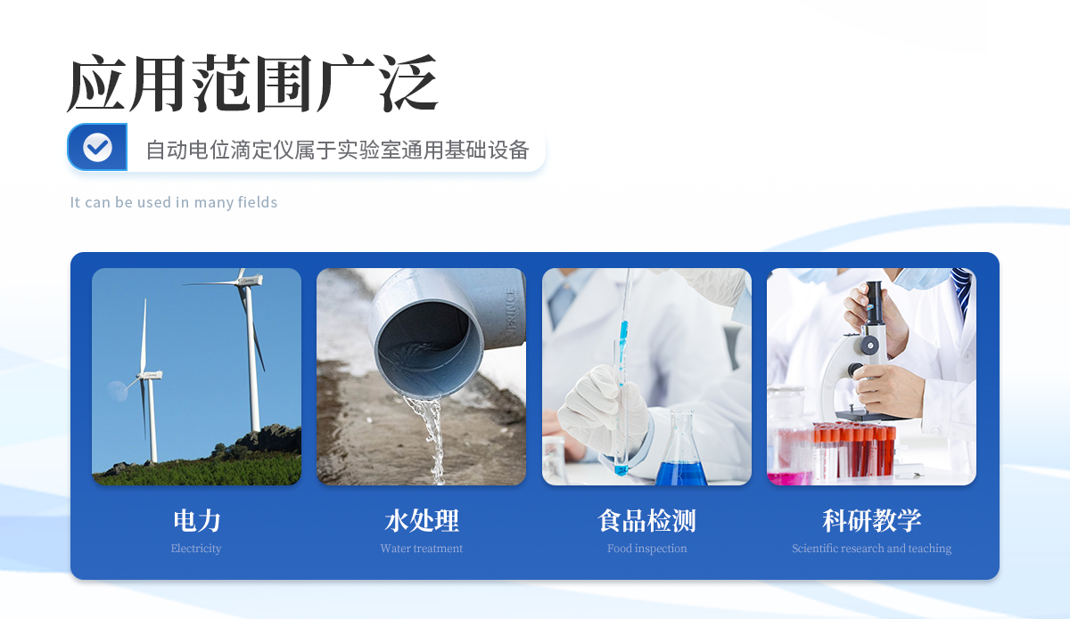 | 自動電位滴定儀屬于實驗室通用基礎(chǔ)設(shè)備,使用非常廣泛,可應(yīng)用在食品、藥檢、疾控、商檢、水處理、石油、化工、海洋、電力、環(huán)保、新能源、教學(xué)、科研等相關(guān)領(lǐng)域。 |