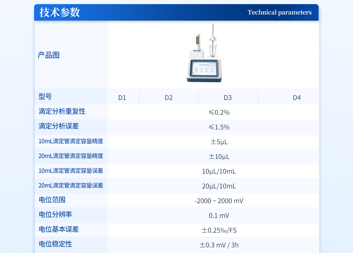 | 自動電位滴定儀是一種用于化學(xué)分析的精密儀器,他通過自動添加滴定劑來確定樣品中特定成分的濃度。該儀器基于電位滴定原理工作,即根據(jù)在滴定過程中電池電動勢的變化來確定滴定終點的一款滴定設(shè)備。設(shè)備滿足國家檢定規(guī)程JJG 814-2015《自動電位滴定儀》儀器級別中的0.05級別,即儀器**示值誤差為±1.5%,儀器示值重復(fù)性≤0.2% |