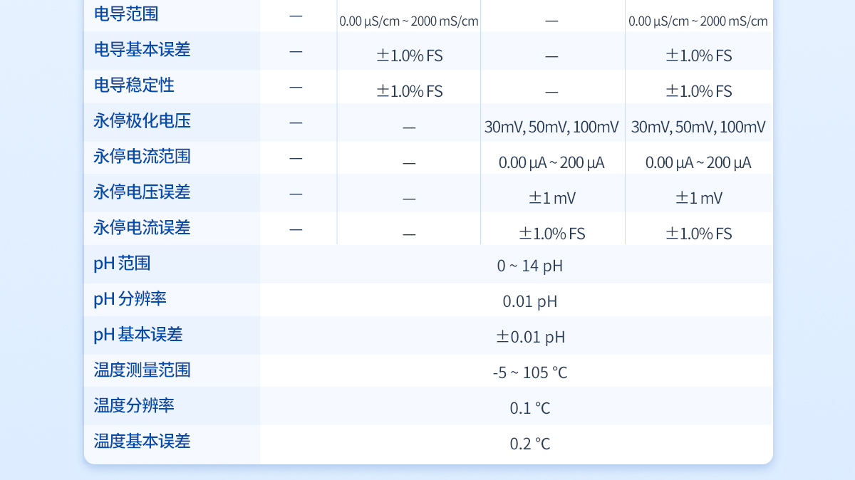 | 滴定分析重復(fù)性:≤0.2% | 滴定分析誤差:≤1.5% | 10mL滴定管滴定容量精度:±5μL | 20mL滴定管滴定容量精度:±10μL | 10mL滴定管滴定容量誤差:10μL/10mL | 20mL滴定管滴定容量誤差:20μL/10mL | 電位范圍:-2000—2000mV | 電位分辨率:0.1mV | 電位基本誤差mV:±0.25‰/FS | 電位穩(wěn)定性mV:±0.3mV/3h | 電導(dǎo)范圍:0.00uS/cm-2000mS/cm | 電導(dǎo)基本誤差:±1.0% FS | 電導(dǎo)穩(wěn)定性:±1.0% FS | pH范圍:0-14PH | pH分辨率:0.01PH | pH基本誤差:±0.01PH | 溫度測量范圍:-5 - 105℃ | 溫度分辨率:0.1℃ | 溫度基本誤差:0.2℃ |