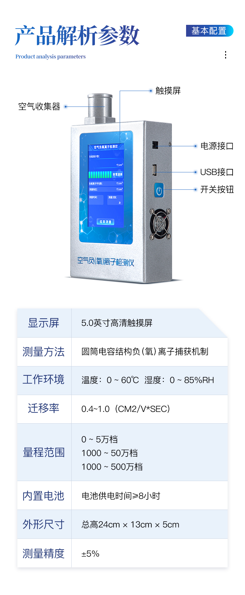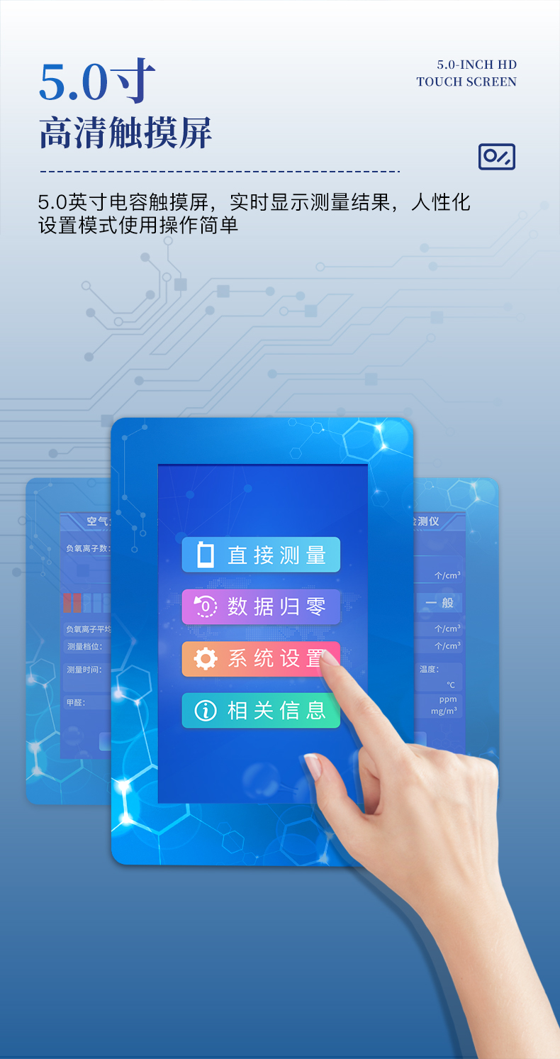 1、屏幕顯示:5.0英寸電容觸摸屏,800*480高分辨率,實時顯示負(fù)(氧)離子測量結(jié)果;