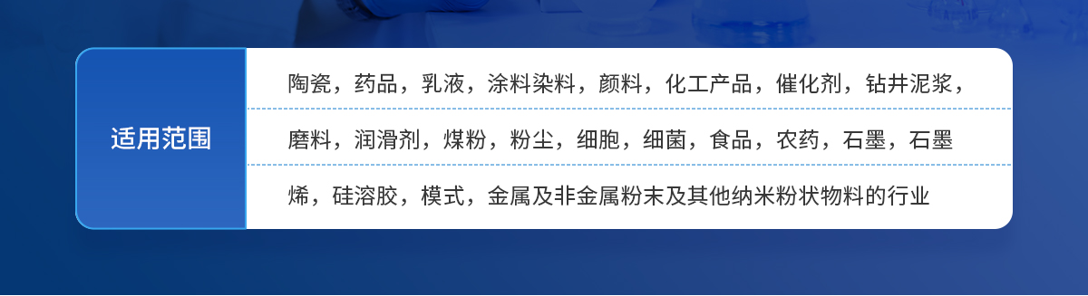 YT-QJLS-2000廣泛應(yīng)用于水泥、陶瓷、藥品、乳液、涂料、染料、顏料、填料、化工產(chǎn)品、催化劑、鉆井泥漿、磨料、潤滑劑、煤粉、泥砂、粉塵、細(xì)胞、細(xì)菌、食品、添加劑、農(nóng)藥、炸藥、石墨、感光材料、燃料、墨汁、金屬與非金屬粉末、碳酸鈣、高嶺土、水煤漿及其他粉狀物料。
