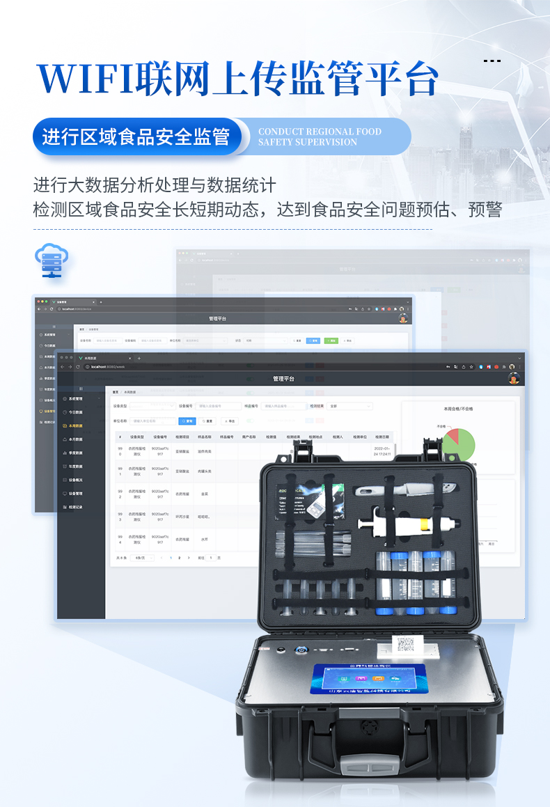 機(jī)箱采用工業(yè)級ABS工程塑料箱,方便攜帶,穩(wěn)固耐用,便于流動測試。安卓智能操作系統(tǒng),采用更加**和人性化操作,儀器具有網(wǎng)線連接、wifi聯(lián)網(wǎng)上傳、4G無線遠(yuǎn)傳功能,快速上傳數(shù)據(jù)。智能化程度高,儀器具有自檢功能:具有開機(jī)自檢和調(diào)零功能,具有自動檢測重復(fù)性功能。新一代高速熱敏打印機(jī),檢測完成可自動打印檢測報告和二維碼。儀器帶有監(jiān)管平臺,數(shù)據(jù)可局域網(wǎng)和互聯(lián)網(wǎng)數(shù)據(jù)上傳,檢測結(jié)果直接傳至食品安全監(jiān)管平臺。進(jìn)行區(qū)域食品安全監(jiān)管及大數(shù)據(jù)分析處理與數(shù)據(jù)統(tǒng)計,檢測區(qū)域食品安全長短期動態(tài),達(dá)到食品安全問題預(yù)估、預(yù)警一體化主機(jī),包含食品安全檢測模塊、多通道農(nóng)藥殘留檢測模塊、膠體金免疫層析檢測模塊。一體化便攜式快檢設(shè)備,滿足現(xiàn)場及流動檢測使用需求,能夠在同一軟件下實(shí)現(xiàn)所有檢測項目的檢測,并可通過同一窗口直觀顯示檢測結(jié)果。CT線自動識別,無需手動調(diào)整。儀器具有品類多種類樣品菜單庫,可靈活選擇檢測樣品,不同的檢測通道可同時檢測不同的樣品項目。樣品處理簡單省力,整體操作快速、安全、便捷。儀器具有自身保護(hù)功能,可設(shè)置用戶名及密碼,防止非工作人員操作等。高靈敏度,高檢測精度,高重復(fù)性精度,掃描式高精度光學(xué)傳感器。內(nèi)置強(qiáng)大的數(shù)據(jù)庫,可在儀器上直接選擇樣品名稱、檢測指標(biāo)、送檢單位等信息,也可在儀器上直接編輯錄入樣品名稱、檢測指標(biāo)、送檢單位等信息并保存進(jìn)樣品數(shù)據(jù)庫。儀器具有重新校準(zhǔn)、鎖定、恢復(fù)出廠設(shè)置功能。支持U盤存儲。 結(jié)果判定線可修改,對照值標(biāo)定值可保存,斷電不丟失數(shù)據(jù)兼容市場上所有的膠體金卡,使用耗材不受限制,極大增強(qiáng)用戶使用體驗。