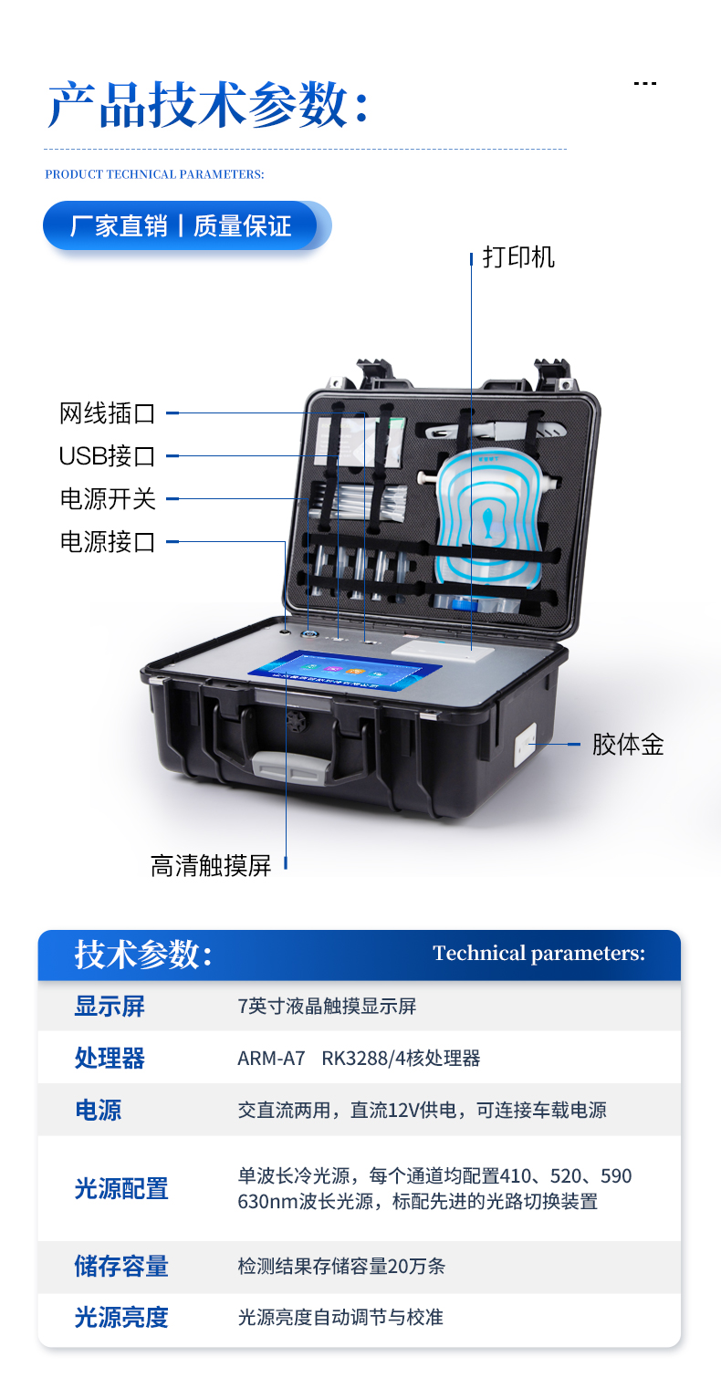 主控芯片采用ARM Cortex-A7,RK3288/4核處理器,主頻1.88Ghz,運(yùn)轉(zhuǎn)速度更快速,穩(wěn)定性更強(qiáng)。顯示方式:7英寸液晶觸摸屏顯示,人性化中文操作界面,讀數(shù)直觀、簡單。交直流兩用,直流12V供電,可連接車載電源,可配6ah大容量充電鋰電池,方便戶外流動測試。光源亮度自動調(diào)節(jié)與校準(zhǔn)智能恒流穩(wěn)壓,光強(qiáng)自動校準(zhǔn),長時間連續(xù)工作光源無溫漂現(xiàn)象。內(nèi)置新國家限量標(biāo)準(zhǔn),與所測結(jié)果進(jìn)行現(xiàn)場比對,并持續(xù)更新標(biāo)準(zhǔn)。不間斷進(jìn)樣,連續(xù)檢測樣本編號自動累加。檢測項目可擴(kuò)充。檢測結(jié)果可批量打印,批量上傳。檢測結(jié)果為Excel表格,連接電腦即可拷貝檢測結(jié)果存儲容量20萬條標(biāo)準(zhǔn)USB接口,免驅(qū)動安裝。固件可升級