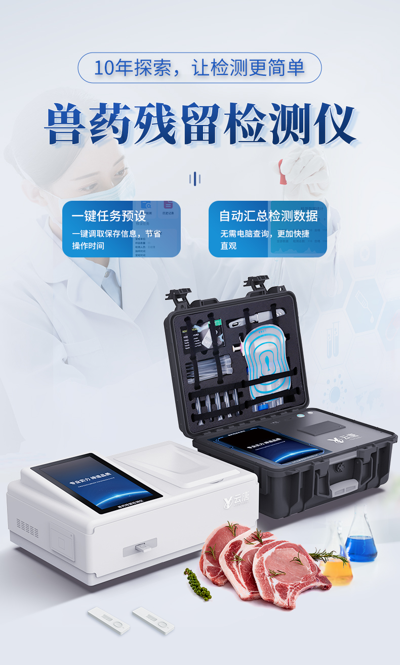 山東云唐智能科技有限公司生產(chǎn)的病害肉檢測儀為集成化食品安全快速檢測分析設(shè)備,采用臺式一體化設(shè)計(jì),可對豬肉、牛肉、羊肉、魚類等存在的病害肉組胺、揮發(fā)性鹽基氮進(jìn)行快速定量檢測,儀器預(yù)留其他項(xiàng)目檢測程序和端口,根據(jù)日后需求可進(jìn)行升級