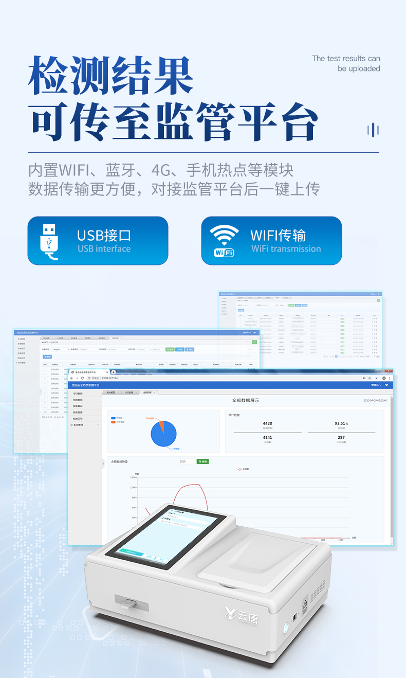 | 1、儀器采用臺式一體化系統(tǒng)檢測技術(shù),將分光光度模塊、數(shù)字化管理模塊、無線通訊模塊高度集成于一體,支持檢測幾十種食品安全檢測項(xiàng)目,同時預(yù)留升級檢測方法。 | 2、儀器檢測模塊標(biāo)準(zhǔn)化、智能化,檢測項(xiàng)目可隨意自由組合。檢測箱體內(nèi)置多個標(biāo)準(zhǔn)檢測單元,檢測模塊可以調(diào)整配置。 | 3、顯示屏幕:儀器采用7英寸液晶觸摸屏,搭配運(yùn)行安卓智能操作系統(tǒng),主控芯片采用ARM Cortex-A7,RK3288/4核處理器,主頻1.88Ghz,操作方便,性能更強(qiáng)。 | 4、檢測通道:≥12通道;采用精密旋轉(zhuǎn)比色池設(shè)計(jì),使用同芯片同光源校準(zhǔn)精度,解決不同光源之間的誤差值,更加準(zhǔn)確**。 | 5、儀器光源:高精度進(jìn)口四波長冷光源,每個通道均配置 410、520、590、630nm 波長光源,標(biāo)配**的光路切換裝置,**光路切換功能可實(shí)現(xiàn)64波長,并且所有檢測項(xiàng)目可實(shí)現(xiàn)所有通道同時檢測。 | 6、通訊接口:配備無線通信模塊、可選配4G(APN)通訊模塊和藍(lán)牙傳輸,同時具有USB接口,可以多方式實(shí)現(xiàn)數(shù)據(jù)保存及數(shù)據(jù)傳輸。 | 7、存儲方式:支持U盤存儲,標(biāo)準(zhǔn)USB接口,免驅(qū)動安裝。檢測結(jié)果存儲容量20萬條以上,可生成Excel表格進(jìn)行拷貝,并具有登錄保護(hù)功能。 | 8、智能化操作系統(tǒng) | 8.1、操作系統(tǒng):儀器可在同一檢測界面自動對應(yīng)相關(guān)檢測通道,一次性選擇1-12個樣品名稱,無需退出界面,節(jié)省操作時間。并可以對每個通道屬性和樣品信息單獨(dú)進(jìn)行編輯,例如送檢單位、人員,檢測人員等,打印時勾選打印顯示。 | 8.2、限量規(guī)判系統(tǒng):具有限量查詢、添加物質(zhì)合規(guī)判定系統(tǒng)。檢測出結(jié)果后,系統(tǒng)自動調(diào)用系統(tǒng)數(shù)據(jù)庫中相關(guān)國標(biāo)進(jìn)行比對判定,客觀顯示結(jié)果是否合格。 | 8.3、數(shù)據(jù)監(jiān)管系統(tǒng):同步對接監(jiān)管平臺,數(shù)據(jù)可局域網(wǎng)和互聯(lián)網(wǎng)數(shù)據(jù)上傳,檢測結(jié)果可選擇直接傳至食品安全監(jiān)管平臺。進(jìn)行區(qū)域食品安全監(jiān)管及大數(shù)據(jù)分析處理與數(shù)據(jù)統(tǒng)計(jì),檢測區(qū)域食品安全長短期動態(tài),達(dá)到食品安全問題預(yù)估、預(yù)警。 | 8.4、打印系統(tǒng):內(nèi)置全新打印機(jī),可以打?。喉?xiàng)目名稱,二維碼,抽樣信息、檢測信息,受檢信息、復(fù)核信息、抽樣日期、檢測日期等信息的打印。 | 9、供電模式:儀器交直流兩用,直流12V供電(標(biāo)配),可連接車載電源,亦可選配6ah大容量充電鋰電池,電量可實(shí)時顯示,方便戶外流動測試。 | 10、儀器具有重新校準(zhǔn)、鎖定、恢復(fù)出廠設(shè)置功能, | 11、外觀尺寸:415X310X150(mm) ,并可加配鋁合金手提箱 |