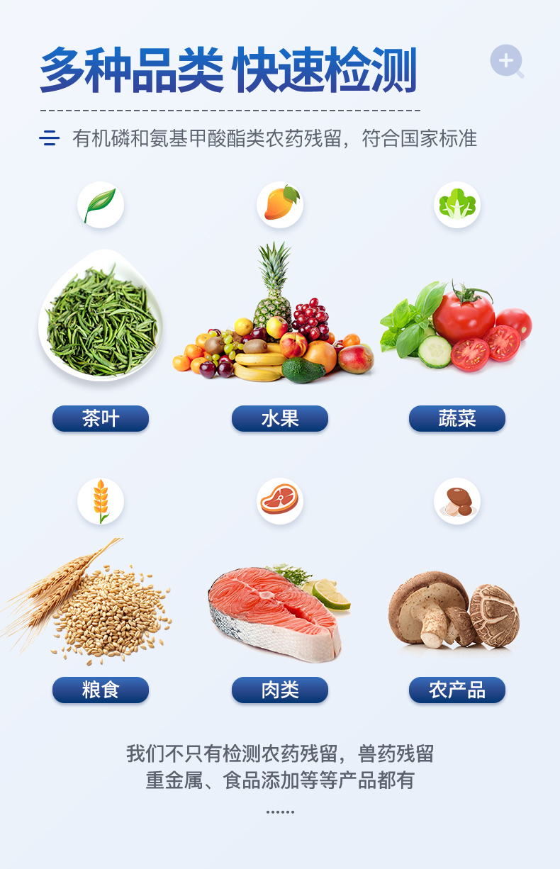 廣泛應(yīng)用于主要用于蔬菜、水果、茶葉、糧食、農(nóng)副產(chǎn)品等食品中有機磷和氨基甲酸酯類農(nóng)藥殘留的快速檢測;此外還可用于果蔬茶生產(chǎn)基地和農(nóng)貿(mào)批發(fā)銷售市場現(xiàn)場檢測,餐館、學校、食堂、家庭果蔬加工前的安全速測等。