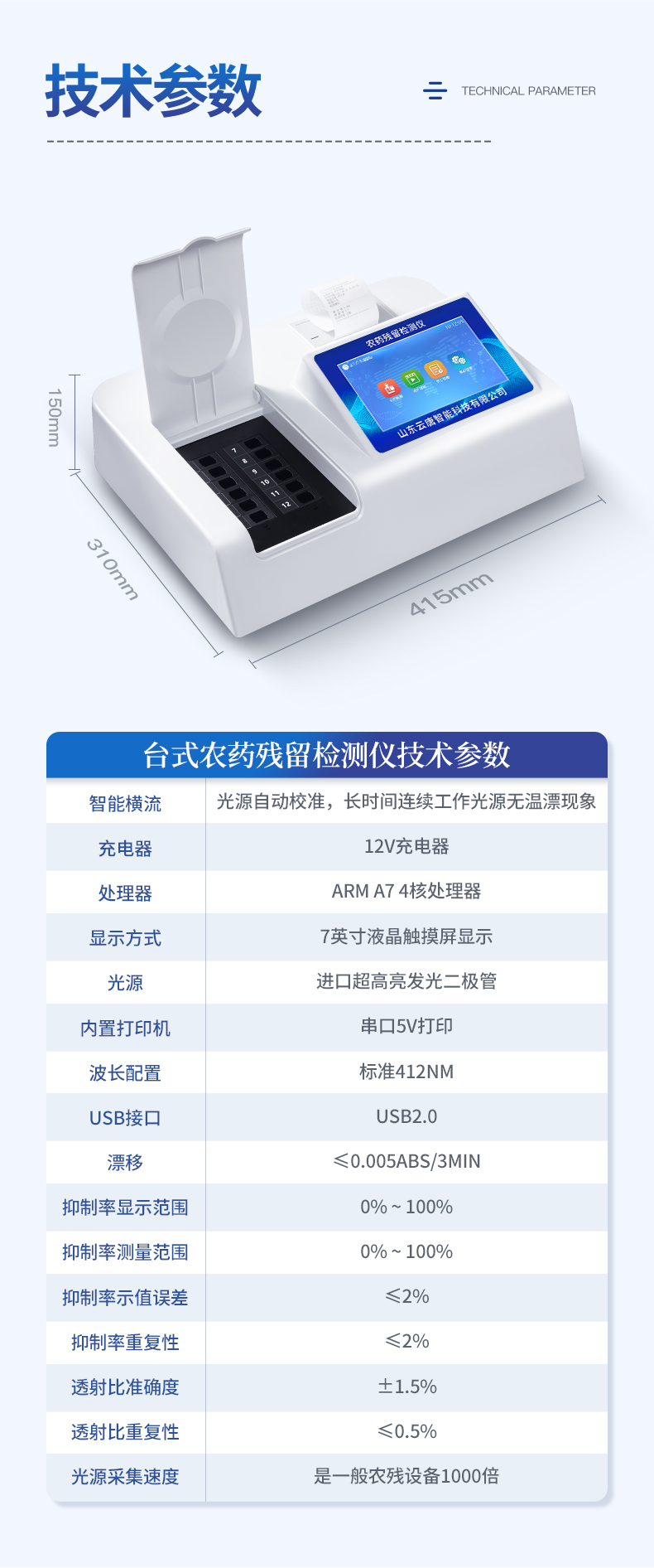 檢測標(biāo)準(zhǔn):依據(jù)國家標(biāo)準(zhǔn)方法(GB/T5009.199-2003)以及世界衛(wèi)生組織WHO、世界糧農(nóng)組織FAO殘留農(nóng)藥檢測標(biāo)準(zhǔn)、世界環(huán)境保護(hù)局EPA參照攝入量等要求來設(shè)計(jì)。采用酶抑制率比色法對水果、蔬菜等農(nóng)林產(chǎn)品中有機(jī)磷和氨基甲酸酯類農(nóng)藥含量進(jìn)行快速準(zhǔn)確的檢測。