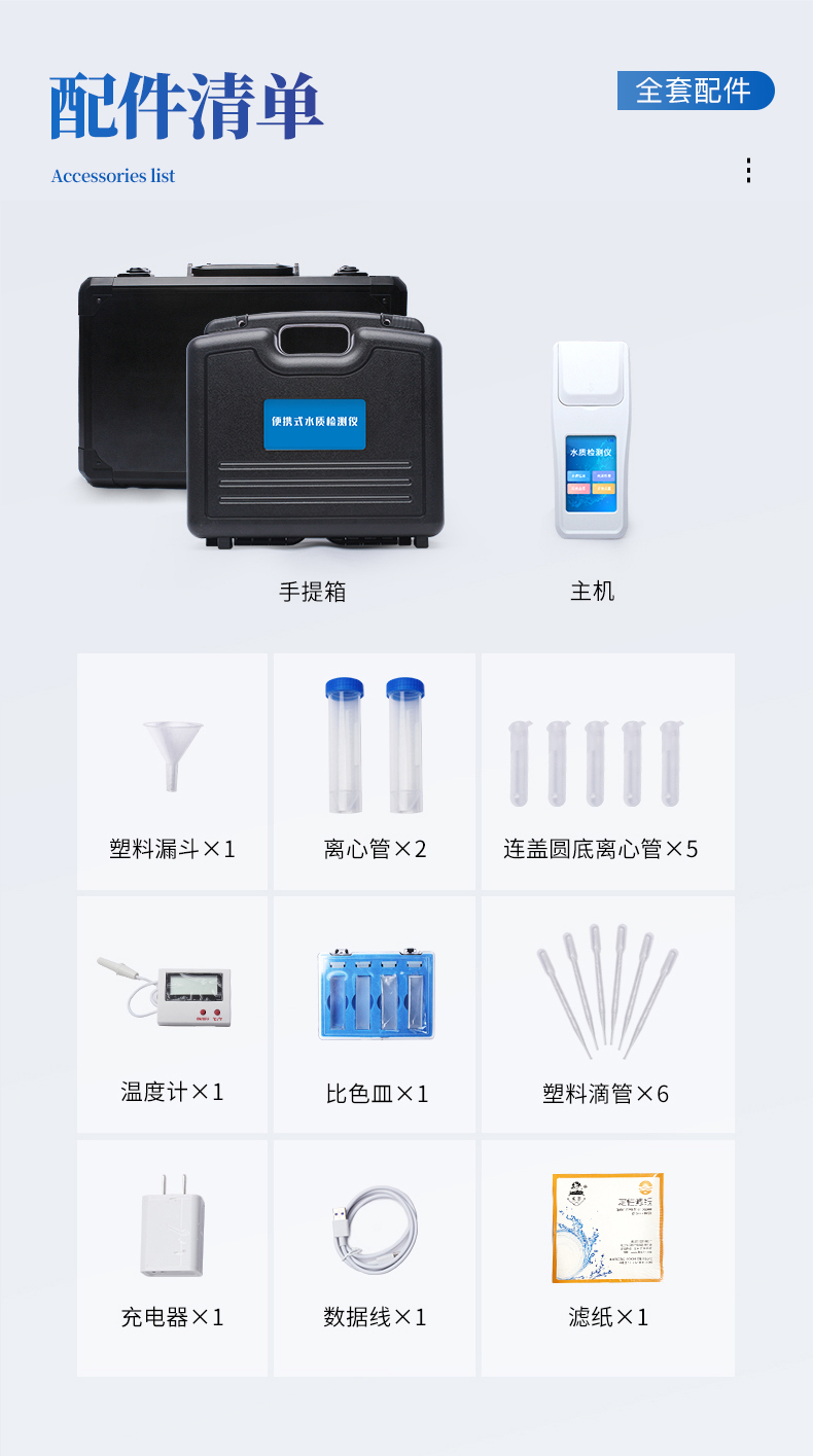提取一定量水體樣品,經(jīng)過前處理后根據(jù)不同檢測(cè)項(xiàng)目按照試劑說明書滴入檢測(cè)試劑,檢測(cè)試劑會(huì)與水體中的待測(cè)物質(zhì)發(fā)生反應(yīng),反應(yīng)液呈現(xiàn)特定的顏色。