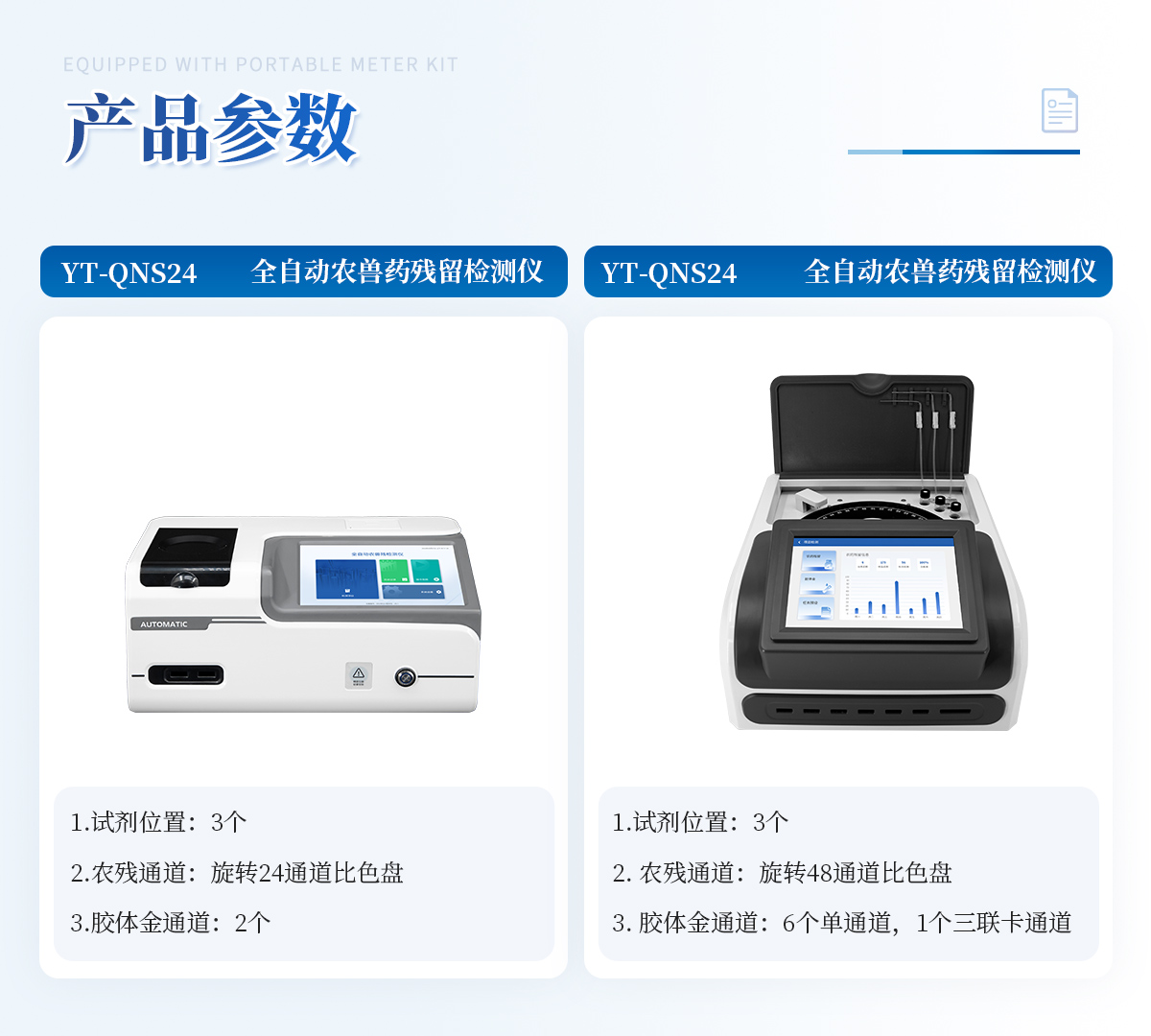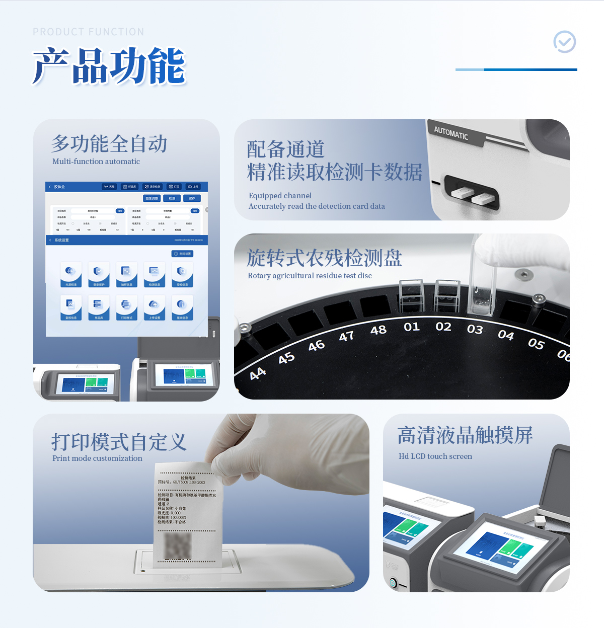 1. 試劑位置:3個 2. 農(nóng)殘檢測盤:旋轉(zhuǎn)24通道比色盤,可任意選擇檢測通道,自動對應(yīng)選擇通道。 3. 膠體金通道:2個,可讀取檢測卡結(jié)果,自動采集、處理分析,自動判斷檢測結(jié)果,并具備自動判空功能。 4.系統(tǒng)配置:10.1寸高清液晶觸摸屏,采用ARM Cortex?-A7,RK3288/4核處理器,運(yùn)行內(nèi)存1GB。Android7.1.1 系統(tǒng)分辨率1280×800。 5.恒溫系統(tǒng):具有自動加溫溫控系統(tǒng),精準(zhǔn)恒溫37℃,精度±0.1℃。 6.添加系統(tǒng):儀器按照試劑要求自動、按時、按量加入試劑,并且自動對未正常放置的樣本或異常的樣本進(jìn)行檢查并提示。 7.清洗功能:儀器具備回流及自動清洗管路功能,避免試劑污染。 8.混勻功能:設(shè)備具備自動混勻功能。 9.光源校準(zhǔn):設(shè)備可自動校準(zhǔn),確保檢測準(zhǔn)確度。 10.實(shí)時監(jiān)控:儀器測試過程中屏幕顯示運(yùn)行狀態(tài),可實(shí)時查看。 11.數(shù)據(jù)存儲:內(nèi)部存儲16GB,可存儲500萬條數(shù)據(jù)。 12.樣品多選功能:設(shè)備具備樣品一鍵多選功能,選擇樣品自動匹配檢測通道。 13.項(xiàng)目預(yù)設(shè):可提前設(shè)置單個及多個相同或不相同的檢測任務(wù),可單次或者多次調(diào)取,減少檢測時間。 14.自定義打印系統(tǒng):內(nèi)置自定義打印系統(tǒng),可按需靈活設(shè)置開啟或關(guān)閉:產(chǎn)品合格證(國家農(nóng)業(yè)部標(biāo)準(zhǔn)),二維碼,抽樣信息、檢測信息,受檢信息等信息的打印。 15.A4版本報告打印功能:設(shè)備可自動生成A4版報告,A4報告帶二維碼,可掃描二維碼生成電子版,并可識別真?zhèn)巍? 16.傳輸方式:儀器配備無線通信模塊: 4G(APN)通訊模塊、Wifi模塊,藍(lán)牙傳輸模塊,同時具有USB接口以及RJ45接口能以多種方式實(shí)現(xiàn)數(shù)據(jù)保存和數(shù)據(jù)傳輸功能,設(shè)備數(shù)據(jù)可以同步上傳至平臺。 17.系統(tǒng)17.數(shù)據(jù)監(jiān)管系統(tǒng):設(shè)備自帶監(jiān)管平臺,并可同步對接監(jiān)管平臺,數(shù)據(jù)可局域網(wǎng)和互聯(lián)網(wǎng)數(shù)據(jù)上傳,檢測結(jié)果可直接傳至食品安全監(jiān)管平臺。達(dá)到食品安全問題預(yù)估、預(yù)警。 18.系統(tǒng)遠(yuǎn)程更新功能:無需設(shè)備返廠,即可遠(yuǎn)程實(shí)時升級全新系統(tǒng),節(jié)省時間成本及避免運(yùn)輸造成設(shè)備損。