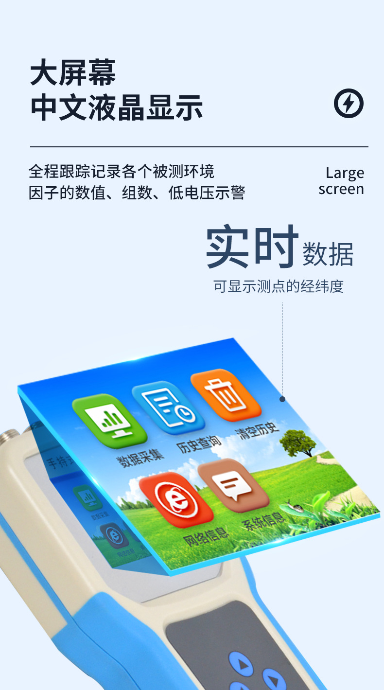 .大屏幕中文液晶顯示,全程跟蹤記錄各個(gè)被測(cè)環(huán)境因子的數(shù)值、組數(shù)、低電壓示警,主機(jī)內(nèi)置大容量存儲(chǔ)器,可儲(chǔ)存三十萬(wàn)條數(shù)據(jù),具有斷電數(shù)據(jù)自動(dòng)存儲(chǔ)保護(hù)功能。
