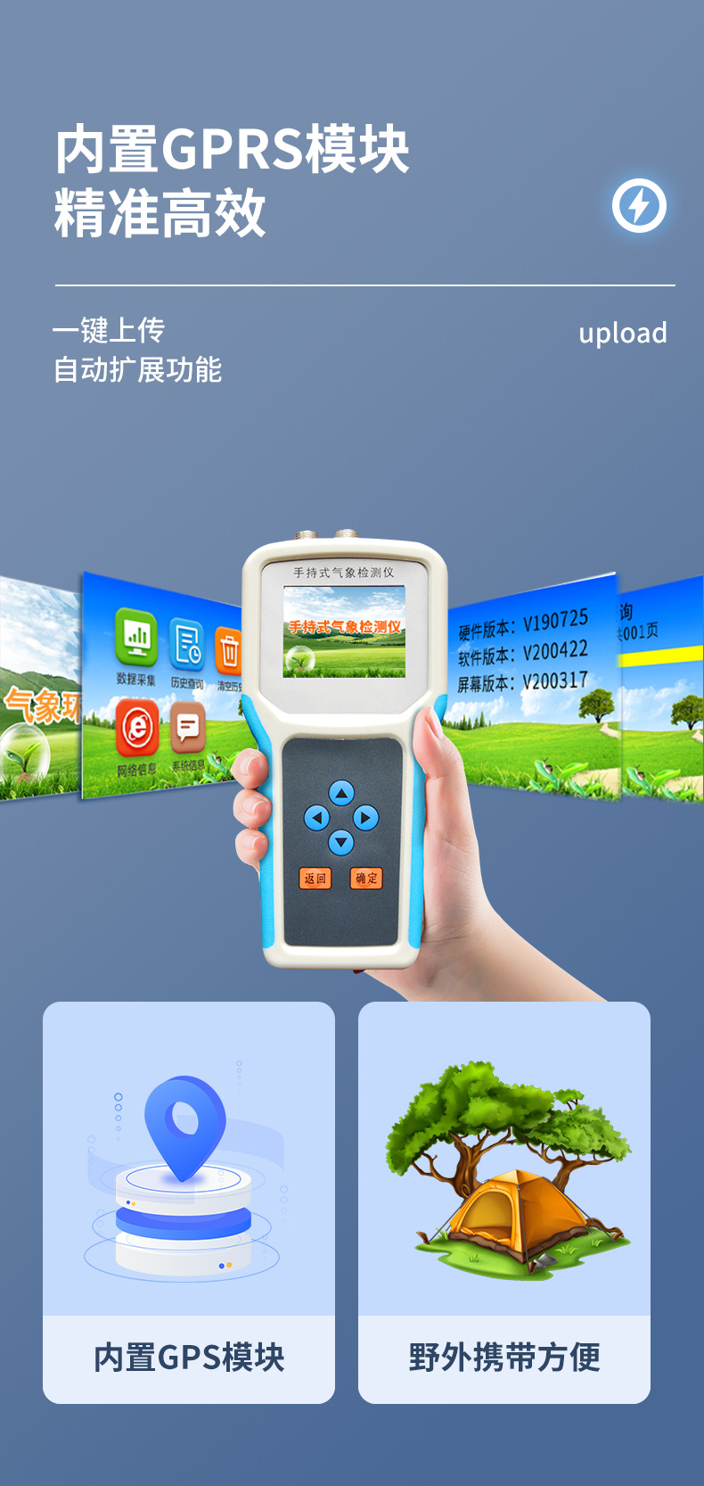 .采用一體化結(jié)構(gòu)設(shè)計(jì),內(nèi)置GPS模塊,GPRS模塊,外置SD卡,能準(zhǔn)確的測(cè)量出被測(cè)地點(diǎn)的地理信息,界面除顯示所測(cè)環(huán)境參數(shù)、存儲(chǔ)數(shù)據(jù)外,還可顯示測(cè)點(diǎn)的經(jīng)緯度。通過(guò)內(nèi)置的GPRS一鍵上傳被測(cè)點(diǎn)的環(huán)境因子測(cè)量數(shù)據(jù)等。同時(shí)還可以通過(guò)外置SD卡直接把數(shù)據(jù)導(dǎo)出到電腦上。(可選)