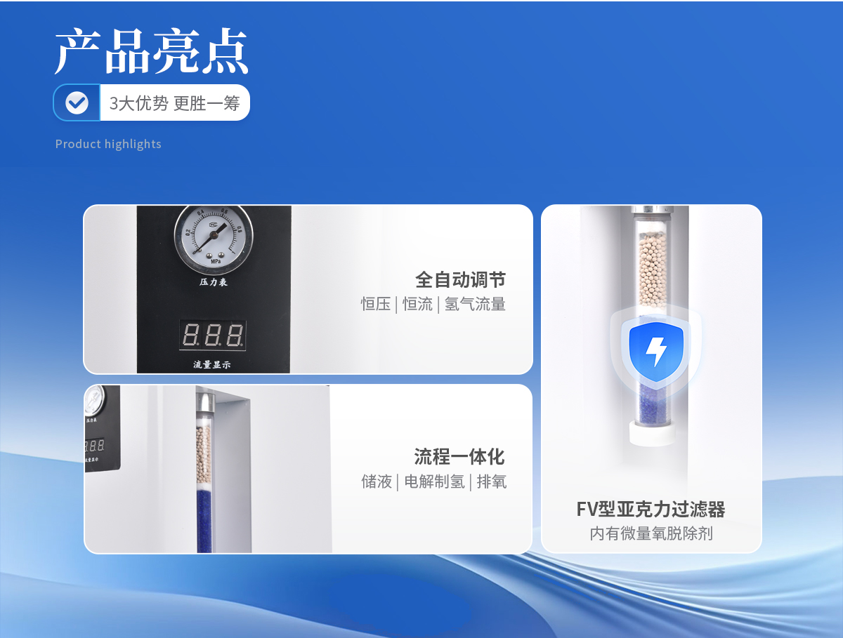 | 1、壓力、流量自動顯示,自動恒壓、恒流、氫氣流量可根據(jù)用量實現(xiàn)全自動調(diào)節(jié)。 | 2、FV型亞克力過濾器,內(nèi)有微量氧脫除劑(不需要活化),氫氣純度更高;儀器內(nèi)部采用硅橡膠圈(含硫量低),有效提高氣體質(zhì)量,保證色譜基線平穩(wěn)。 | 3、儲液、電解制氫、排氧一體化,池溫低,壽命長久。 | 4、配有安全裝置,靈敏可靠,自動防返堿。 |