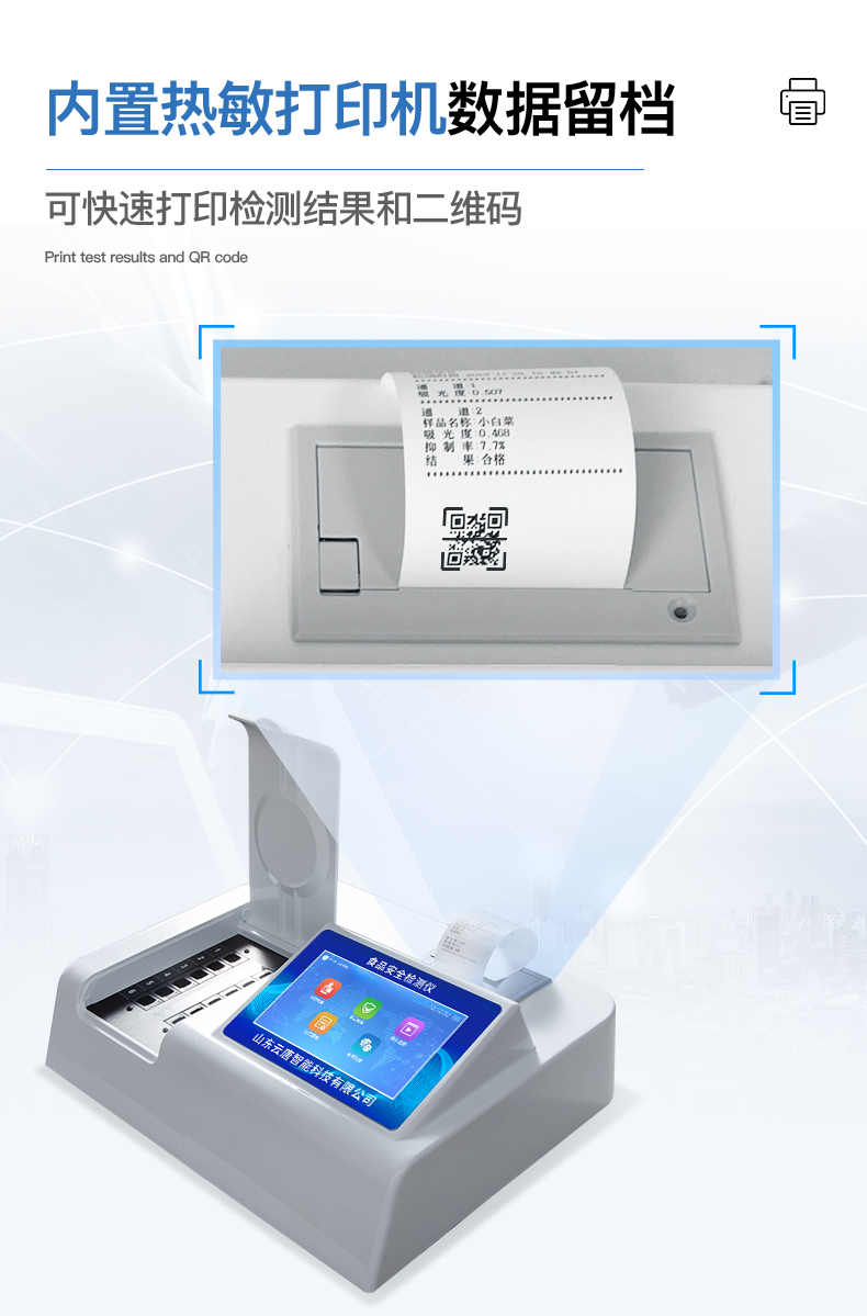 | 安卓智能操作系統(tǒng),采用更加**和人性化操作,儀器具有網(wǎng)線連接、wifi聯(lián)網(wǎng)上傳、GPRS無線遠(yuǎn)傳功能,快速上傳數(shù)據(jù)。 | 智能化程度高,儀器具有自檢功能:具有開機(jī)自檢和調(diào)零功能,具有自動檢測重復(fù)性功能。 | 檢測通道:≥12個檢測通道,可以同時測試多個樣品,每個樣品由程序控制分別獨立工作,不會互相干擾。 | 顯示方式:≥8英寸液晶觸摸屏顯示,人性化中文操作界面,讀數(shù)直觀、簡單。 | 配備新一代嵌入式熱敏打印機(jī),可選擇手動打印或者自動打印,檢測完成可自動打印檢測報告和二維碼。 | 光源采用進(jìn)口超高亮發(fā)光二極管,高精度、穩(wěn)定性強(qiáng)、光源可控、可以關(guān)掉不使用的光源,功耗更低。 | 采用USB2.0接口設(shè)計,方便數(shù)據(jù)的存貯和移動,并可隨時與計算機(jī)直接相連,并且可用計算機(jī)控制儀器。實現(xiàn)數(shù)據(jù)查詢、瀏覽、分析、統(tǒng)計、打印等。 | 儀器帶有監(jiān)管平臺。數(shù)據(jù)可局域網(wǎng)和互聯(lián)網(wǎng)數(shù)據(jù)上傳,檢測結(jié)果直接傳至食品安全監(jiān)管平臺。進(jìn)行區(qū)域食品安全監(jiān)管及大數(shù)據(jù)分析處理,檢測區(qū)域食品安全長短期動態(tài),達(dá)到食品安全問題預(yù)估、預(yù)警 | 一體化便攜式快檢設(shè)備,滿足現(xiàn)場及流動檢測使用需求,能夠在同一軟件下實現(xiàn)所有檢測項目的檢測,并可通過同一窗口直觀顯示檢測結(jié)果。 | 儀器具有多品類多種類樣品菜單庫,可靈活選擇檢測樣品,不同的檢測通道可同時檢測不同的樣品項目。也可在儀器上直接編輯錄入樣品名稱、檢測指標(biāo)、送檢單位等信息并保存進(jìn)樣品數(shù)據(jù)庫。 | 樣品處理簡單省力,整體操作快速、安全、便捷。 | 儀器具有自身保護(hù)功能,可設(shè)置用戶名及密碼,防止非工作人員操作等。 | 高靈敏度,高檢測精度,高重復(fù)性精度,掃描式高精度光學(xué)傳感器。 | 內(nèi)置強(qiáng)大的數(shù)據(jù)庫,可在儀器上直接選擇樣品名稱、檢測指標(biāo)、送檢單位等信息,也可在儀器上直接編輯錄入樣品名稱、檢測指標(biāo)、送檢單位等信息并保存進(jìn)樣品數(shù)據(jù)庫。 | 儀器具有重新校準(zhǔn)、鎖定、恢復(fù)出廠設(shè)置功能。 | 支持U盤存儲。 結(jié)果判定線可修改,對照值標(biāo)定值可保存,斷電不丟失數(shù)據(jù)。 |
