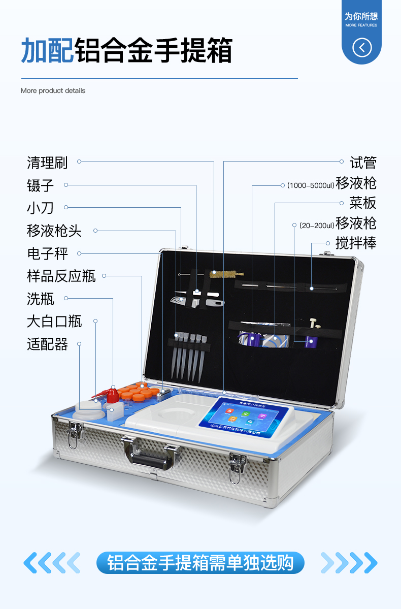 安卓智能操作系統(tǒng),采用更加**和人性化操作,儀器具有網(wǎng)線連接、wifi聯(lián)網(wǎng)上傳、GPRS無(wú)線遠(yuǎn)傳功能,快速上傳數(shù)據(jù)。智能化程度高,儀器具有自檢功能:具有開(kāi)機(jī)自檢和調(diào)零功能,具有自動(dòng)檢測(cè)重復(fù)性功能。檢測(cè)通道:≥12個(gè)檢測(cè)通道,可以同時(shí)測(cè)試多個(gè)樣品,每個(gè)樣品由程序控制分別獨(dú)立工作,不會(huì)互相干擾。顯示方式:≥8英寸液晶觸摸屏顯示,人性化中文操作界面,讀數(shù)直觀、簡(jiǎn)單。配備新一代嵌入式熱敏打印機(jī),可選擇手動(dòng)打印或者自動(dòng)打印,檢測(cè)完成可自動(dòng)打印檢測(cè)報(bào)告和二維碼。光源采用進(jìn)口超高亮發(fā)光二極管,高精度、穩(wěn)定性強(qiáng)、光源可控、可以關(guān)掉不使用的光源,功耗更低。采用USB2.0接口設(shè)計(jì),方便數(shù)據(jù)的存貯和移動(dòng),并可隨時(shí)與計(jì)算機(jī)直接相連,并且可用計(jì)算機(jī)控制儀器。實(shí)現(xiàn)數(shù)據(jù)查詢(xún)、瀏覽、分析、統(tǒng)計(jì)、打印等。儀器帶有監(jiān)管平臺(tái)。數(shù)據(jù)可局域網(wǎng)和互聯(lián)網(wǎng)數(shù)據(jù)上傳,檢測(cè)結(jié)果直接傳至食品安全監(jiān)管平臺(tái)。進(jìn)行區(qū)域食品安全監(jiān)管及大數(shù)據(jù)分析處理,檢測(cè)區(qū)域食品安全長(zhǎng)短期動(dòng)態(tài),達(dá)到食品安全問(wèn)題預(yù)估、預(yù)警一體化便攜式快檢設(shè)備,滿足現(xiàn)場(chǎng)及流動(dòng)檢測(cè)使用需求,能夠在同一軟件下實(shí)現(xiàn)所有檢測(cè)項(xiàng)目的檢測(cè),并可通過(guò)同一窗口直觀顯示檢測(cè)結(jié)果。儀器具有多品類(lèi)多種類(lèi)樣品菜單庫(kù),可靈活選擇檢測(cè)樣品,不同的檢測(cè)通道可同時(shí)檢測(cè)不同的樣品項(xiàng)目。也可在儀器上直接編輯錄入樣品名稱(chēng)、檢測(cè)指標(biāo)、送檢單位等信息并保存進(jìn)樣品數(shù)據(jù)庫(kù)。樣品處理簡(jiǎn)單省力,整體操作快速、安全、便捷。儀器具有自身保護(hù)功能,可設(shè)置用戶(hù)名及密碼,防止非工作人員操作等。高靈敏度,高檢測(cè)精度,高重復(fù)性精度,掃描式高精度光學(xué)傳感器。內(nèi)置強(qiáng)大的數(shù)據(jù)庫(kù),可在儀器上直接選擇樣品名稱(chēng)、檢測(cè)指標(biāo)、送檢單位等信息,也可在儀器上直接編輯錄入樣品名稱(chēng)、檢測(cè)指標(biāo)、送檢單位等信息并保存進(jìn)樣品數(shù)據(jù)庫(kù)。儀器具有重新校準(zhǔn)、鎖定、恢復(fù)出廠設(shè)置功能。支持U盤(pán)存儲(chǔ)。 結(jié)果判定線可修改,對(duì)照值標(biāo)定值可保存,斷電不丟失數(shù)據(jù)。