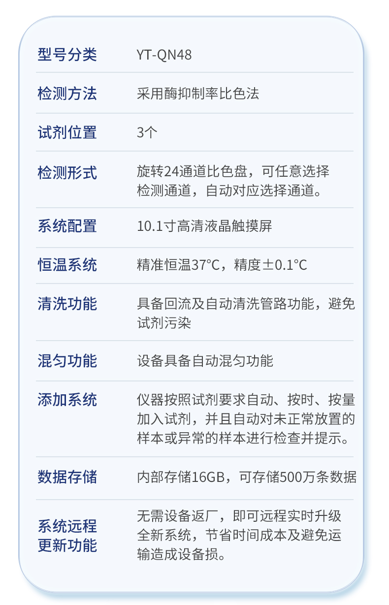 | 1. 試劑位置:3個(gè) | 2. 檢測(cè)形式:旋轉(zhuǎn)48通道比色盤,可任意選擇檢測(cè)通道,自動(dòng)對(duì)應(yīng)選擇通道。 | 3. 系統(tǒng)配置:10.1寸高清液晶觸摸屏,采用ARM Cortex-A7,RK3288/4核處理器,運(yùn)行內(nèi)存1GB。Android7.1.1 系統(tǒng)分辨率1280×800。 | 4.恒溫系統(tǒng):具有自動(dòng)加溫溫控系統(tǒng),精準(zhǔn)恒溫37℃,精度±0.1℃。 | 5.添加系統(tǒng):儀器按照試劑要求自動(dòng)、按時(shí)、按量加入試劑,并且自動(dòng)對(duì)未正常放置的樣本或異常的樣本進(jìn)行檢查并提示。 | 6.清洗功能:儀器具備回流及自動(dòng)清洗管路功能,避免試劑污染。 | 7.混勻功能:設(shè)備具備自動(dòng)混勻功能。 | 8.光源校準(zhǔn):設(shè)備可自動(dòng)校準(zhǔn),確保檢測(cè)準(zhǔn)確度。 | 9.實(shí)時(shí)監(jiān)控:儀器測(cè)試過程中屏幕顯示運(yùn)行狀態(tài),可實(shí)時(shí)查看。 | 10.數(shù)據(jù)存儲(chǔ):內(nèi)部存儲(chǔ)16GB,可存儲(chǔ)500萬(wàn)條數(shù)據(jù)。 | 11.樣品多選功能:設(shè)備具備樣品一鍵多選功能,選擇樣品自動(dòng)匹配檢測(cè)通道。 | 12.項(xiàng)目預(yù)設(shè):可提前設(shè)置單個(gè)及多個(gè)相同或不相同的檢測(cè)任務(wù),可單次或者多次調(diào)取,減少檢測(cè)時(shí)間。 | 13.自定義打印系統(tǒng):內(nèi)置自定義打印系統(tǒng),可按需靈活設(shè)置開啟或關(guān)閉:產(chǎn)品合格證(國(guó)家農(nóng)業(yè)部標(biāo)準(zhǔn)),二維碼,抽樣信息、檢測(cè)信息,受檢信息等信息的打印。 | 14.A4版本報(bào)告打印功能:設(shè)備可自動(dòng)生成A4版報(bào)告,A4報(bào)告帶二維碼,可掃描二維碼生成電子版,并可識(shí)別真?zhèn)巍?/td> | 15.傳輸方式:儀器配備無線通信模塊: 4G(APN)通訊模塊、Wifi模塊,藍(lán)牙傳輸模塊,同時(shí)具有USB接口以及RJ45接口能以多種方式實(shí)現(xiàn)數(shù)據(jù)保存和數(shù)據(jù)傳輸功能,設(shè)備數(shù)據(jù)可以同步上傳至平臺(tái)。 | 16.數(shù)據(jù)監(jiān)管系統(tǒng):設(shè)備自帶監(jiān)管平臺(tái),并可同步對(duì)接監(jiān)管平臺(tái),數(shù)據(jù)可局域網(wǎng)和互聯(lián)網(wǎng)數(shù)據(jù)上傳,檢測(cè)結(jié)果可直接傳至食品安全監(jiān)管平臺(tái)。達(dá)到食品安全問題預(yù)估、預(yù)警。 | 17.系統(tǒng)遠(yuǎn)程更新功能:無需設(shè)備返廠,即可遠(yuǎn)程實(shí)時(shí)升級(jí)全新系統(tǒng),節(jié)省時(shí)間成本及避免運(yùn)輸造成設(shè)備損。 |