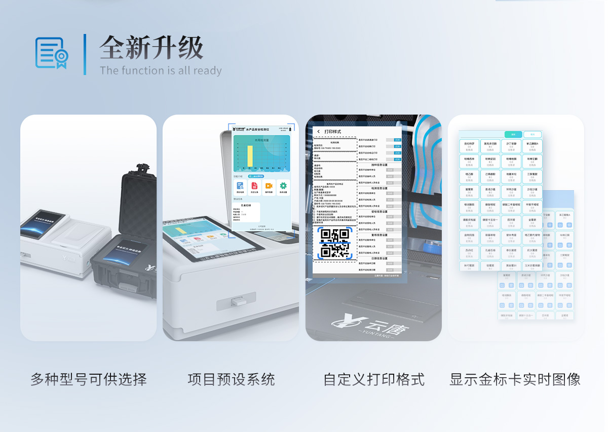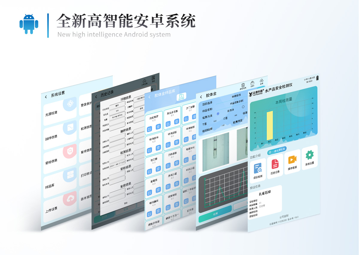 | 1、儀器采用10.1英寸液晶觸摸屏顯,搭配運行安卓智能操作系統(tǒng),主控芯片采用ARM Cortex-A7,RK3288/4核處理器,主頻1.88Ghz,運轉(zhuǎn)速度更快速,性能更強。 | 2、儀器功能包括:膠體金檢測模塊、數(shù)字化管理模塊、無線通訊模塊等,可以滿足同一軟件下實現(xiàn)所有檢測項目的檢測,并在同一窗口展示檢測結(jié)果。 | 3.一體化臺式快檢設(shè)備,采用交直流兩用供電方式,可連接車載電源,配備6ah大容量充電鋰電池,可以滿足現(xiàn)場及流動檢測使用的需求。儀器尺寸:43×35×20cm, 主機(jī)凈重:5.1kg | 4、系統(tǒng)自帶數(shù)據(jù)集成模塊,設(shè)備首頁自動統(tǒng)計檢測數(shù)據(jù)包含:周檢測數(shù)據(jù)、月檢測數(shù)據(jù),全部檢測總數(shù)量,均包含檢測總數(shù),合格數(shù),不合格數(shù),以及相關(guān)柱形分析圖,對各項檢測數(shù)據(jù)清晰掌握,無需電腦查詢,更加快捷直觀。 | 5、儀器具有任務(wù)預(yù)設(shè)模塊,可在樣品送檢前提前預(yù)設(shè)樣品名稱、檢測指標(biāo)、送檢單位等信息,樣品送檢時一鍵調(diào)取保存信息,檢測更加方便快捷。 | 6、膠體金檢測模塊: | 直插式自動掃描方式,可實時顯示金標(biāo)卡實時圖像,系統(tǒng)自動分析并呈現(xiàn)出CT曲線圖,CT線自動識別,無需手動調(diào)整,完成檢測后自動退出檢測卡。 | 結(jié)果判定線可修改,對照值標(biāo)定值可保存,斷電不丟失數(shù)據(jù)。 | 兼容市場上其他膠體金卡,使用耗材不受限制,極大增強用戶使用體驗。 | 7、儀器檢測系統(tǒng)擁有龐大數(shù)據(jù)庫,并且構(gòu)建了完善的檢索、修訂功能。食品庫涵蓋多種樣品名稱,可按需添加或刪除、編輯樣品名稱;產(chǎn)品數(shù)據(jù)庫以及歷史檢測記錄支持一鍵檢索功能。 | 8、系統(tǒng)打印自定義化,打印格式多樣化,產(chǎn)品合格證(國家標(biāo)準(zhǔn)要求),二維碼,抽樣信息、檢測信息,受檢信息、復(fù)核信息、抽樣日期、檢測日期等信息結(jié)果,可按需求自行設(shè)置打印內(nèi)容。 | 9、A4紙版本報告打印功能(可選配):設(shè)備擁有兩種結(jié)果展示方式,可以自動生成A4打印模板和小票打印模板兩種樣式,可通過WiFi及網(wǎng)線等方式鏈接外置打印機(jī)可進(jìn)行打印 | 10、儀器具有 wifi 聯(lián)網(wǎng)上傳、RJ45網(wǎng)線連接功能,可以快速上傳數(shù)據(jù)。同步對接監(jiān)管平臺,數(shù)據(jù)可局域網(wǎng)和互聯(lián)網(wǎng)數(shù)據(jù)上傳,檢測結(jié)果直接傳至食品安全監(jiān)管平臺。進(jìn)行區(qū)域食品安全監(jiān)管及大數(shù)據(jù)分析處理與數(shù)據(jù)統(tǒng)計,檢測區(qū)域食品安全長短期動態(tài),達(dá)到食品安全問題預(yù)估、預(yù)警。 | 11、設(shè)備支持U盤存儲,標(biāo)準(zhǔn)USB接口,免驅(qū)動安裝。檢測結(jié)果存儲容量20萬條以上,可生成Excel表格,進(jìn)行一鍵拷貝,并具有登錄保護(hù)功能,可設(shè)置用戶名及密碼,規(guī)范不同人員操作權(quán)限,防止非工作人員操作,并且可以進(jìn)行重新校準(zhǔn)、鎖定、恢復(fù)出廠設(shè)置功能。儀器固件可升級,后期檢測項目可擴(kuò)充。 | 12、儀器具備遠(yuǎn)程升級功能,可定向分客戶分儀器更新,開機(jī)后自動更新,并可持續(xù)性免費更新系統(tǒng)版本,無需像傳統(tǒng)產(chǎn)品返廠更新,節(jié)省時間及人力成本并避免了物流運輸返廠升級導(dǎo)致設(shè)備損壞的潛在風(fēng)險。 |