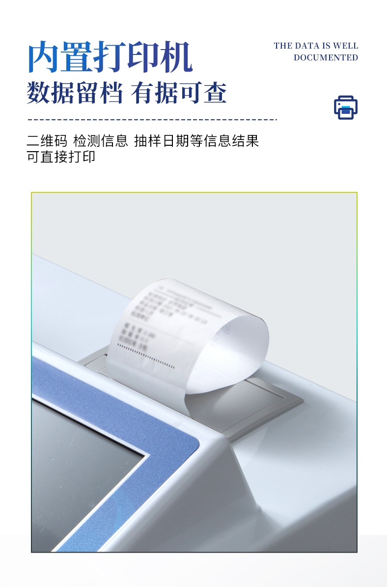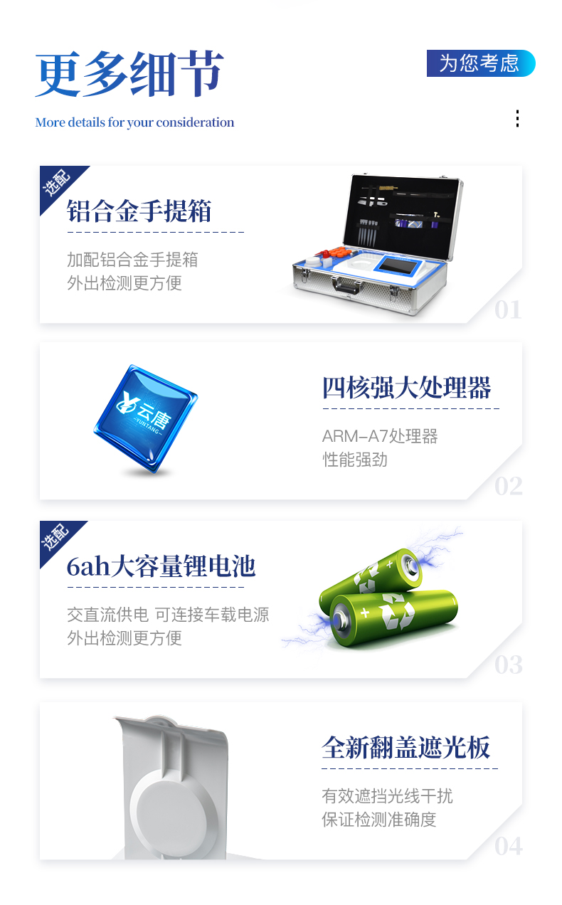 | 主控芯片采用ARM Cortex-A7,RK3288/4核處理器,主頻1.88Ghz,運轉(zhuǎn)速度更快速,穩(wěn)定性更強。 | 顯示方式:7英寸液晶觸摸屏顯示,人性化中文操作界面,讀數(shù)直觀、簡單。 | 直流12V供電,可連接車載電源,可配6ah大容量充電鋰電池,方便戶外流動測試。 | 光源亮度自動調(diào)節(jié)與校準(zhǔn) | 智能恒流穩(wěn)壓,光強自動校準(zhǔn),長時間連續(xù)工作光源無溫漂現(xiàn)象。 | 內(nèi)置新國家限量標(biāo)準(zhǔn),與所測結(jié)果進行現(xiàn)場比對,并持續(xù)更新標(biāo)準(zhǔn)。 | 不間斷進樣,連續(xù)檢測 | 樣本編號自動累加。 | 檢測項目可擴充。 | 檢測結(jié)果可批量打印,批量上傳。 | 檢測結(jié)果為Excel表格,連接電腦即可拷貝。 | 可配置大容量鋰電池,固件可升級 |