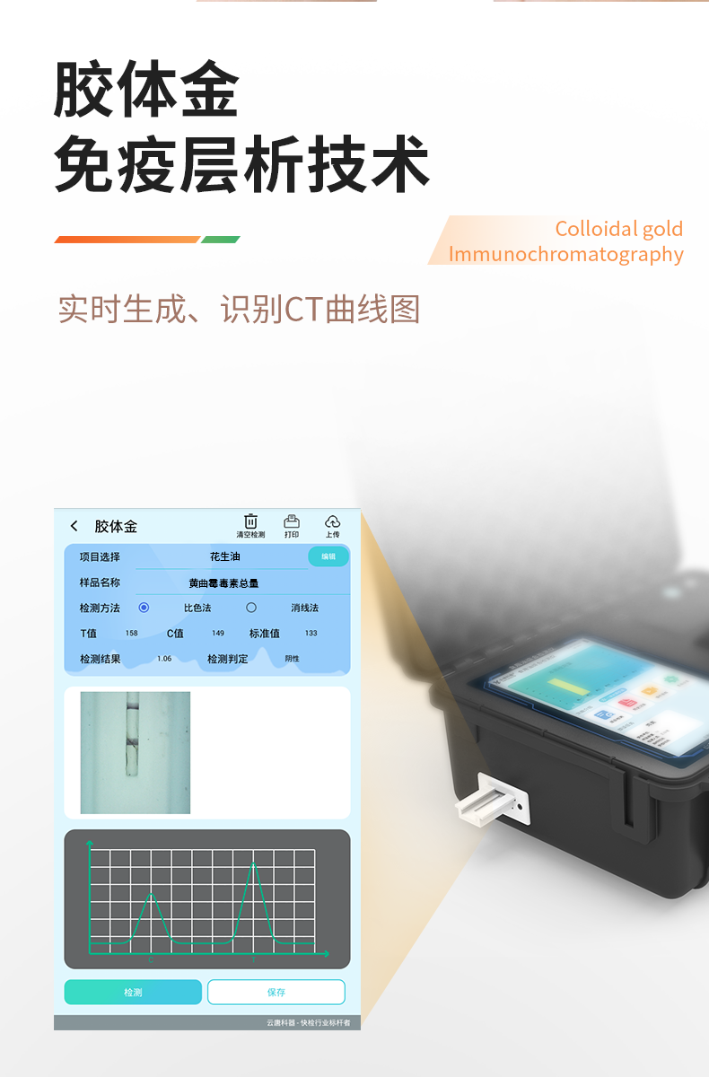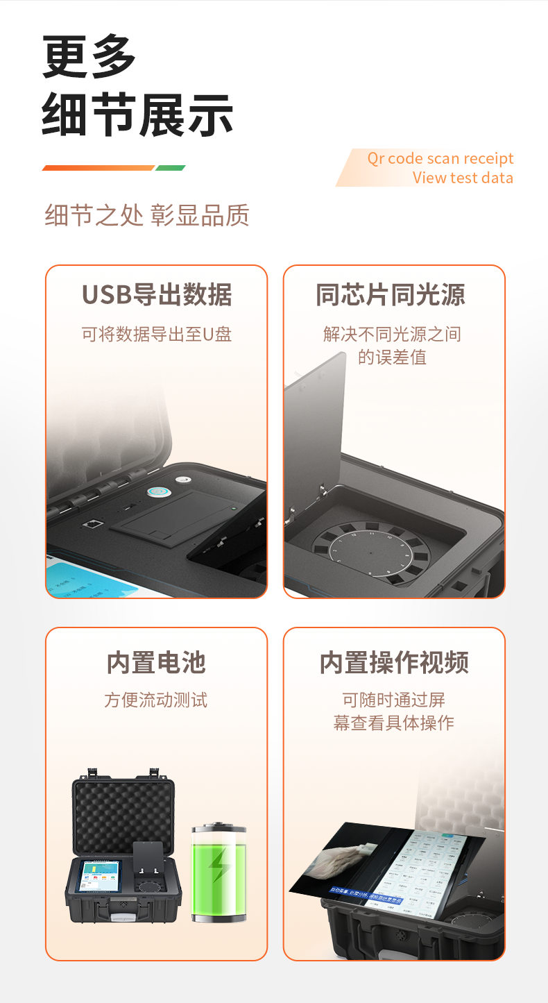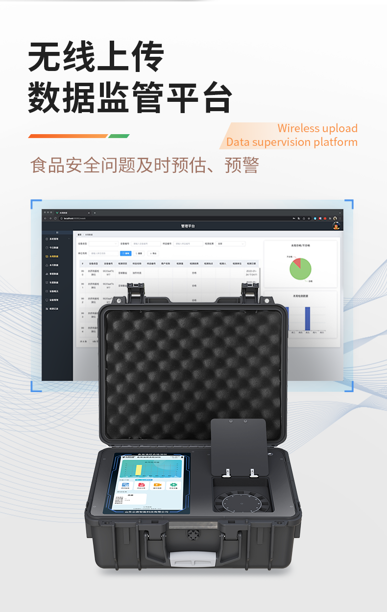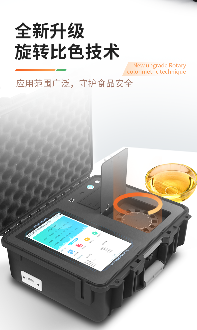 1、儀器采用手提一體化系統(tǒng)檢測技術(shù),將分光光度模塊、膠體金檢測模塊、新型農(nóng)殘檢測模塊、數(shù)字化管理模塊、無線通訊模塊高度集成于一體,支持檢測200種食品安全檢測項目,同時預(yù)留升級檢測方法。2、儀器檢測模塊標(biāo)準(zhǔn)化、智能化,檢測項目可隨意自由組合。檢測箱體內(nèi)置多個標(biāo)準(zhǔn)檢測單元,檢測模塊可以調(diào)整配置。3、顯示屏幕:儀器采用10.1英寸豎向液晶觸摸屏顯,搭配運行安卓智能操作系統(tǒng),主控芯片采用ARM Cortex-A7,RK3288/4核處理器,主頻1.88Ghz,操作方便,性能更強。4、檢測通道:≥12通道;采用精密旋轉(zhuǎn)比色池設(shè)計,使用同芯片同光源校準(zhǔn)精度,解決不同光源之間的誤差值,更加準(zhǔn)確**。(1-12通道間誤差0.1%,**號:**202022821055.2)5、儀器光源:高精度進口四波長冷光源,每個通道均配置 410、520、590、630nm 波長光源,標(biāo)配**的光路切換裝置,**光路切換功能可實現(xiàn)64波長,并且所有檢測項目可實現(xiàn)所有通道同時檢測。6、設(shè)備可一鍵校準(zhǔn),自動保存校準(zhǔn)數(shù)據(jù),自動對比校驗,得到精準(zhǔn)光源,采用Android SP存儲數(shù)據(jù),光源數(shù)據(jù)永不丟失,方便每一次使用。7、通訊接口:配備無線通信模塊、4G(APN)通訊模塊、藍牙傳輸,同時具有雙USB接口以及RJ45網(wǎng)線接口,可以多方式實現(xiàn)數(shù)據(jù)保存及數(shù)據(jù)傳輸。8、存儲方式:支持U盤存儲,標(biāo)準(zhǔn)USB接口,免驅(qū)動安裝。檢測結(jié)果存儲容量20萬條以上,可生成Excel表格進行拷貝,并具有登錄保護功能。9、智能化操作系統(tǒng):9.1、操作系統(tǒng):儀器可在同一檢測界面自動對應(yīng)相關(guān)檢測通道,一次性選擇1-12個樣品名稱,無需退出界面,節(jié)省操作時間。并可以對每個通道屬性和樣品信息單獨進行編輯,例如送檢單位、人員,檢測人員等,打印時勾選打印顯示。9.2、數(shù)據(jù)集成系統(tǒng):設(shè)備首頁自動匯總分析檢測數(shù)據(jù),包含:周檢測數(shù)據(jù)、月檢測數(shù)據(jù),全部檢測總數(shù)量,包含檢測總數(shù),合格數(shù),不合格數(shù),以及相關(guān)柱形分析圖,各項檢測數(shù)據(jù)一目了然,無需電腦查詢,更加快捷直觀。9.3、數(shù)據(jù)庫系統(tǒng):十幾項數(shù)據(jù)庫分類管理儀器:包含項目類型、項目數(shù)據(jù)、檢測數(shù)據(jù)、歷史記錄、國標(biāo)信息、曲線信息、采樣信息、檢測信息、受檢信息、復(fù)核信息、圖表信息、光源校準(zhǔn)信息、打印樣式信息、樣品庫信息等等,數(shù)據(jù)庫之間互相協(xié)調(diào)聯(lián)動保證數(shù)據(jù)的真實完整性。同時產(chǎn)品數(shù)據(jù)庫以及歷史檢測記錄支持一鍵檢索功能。9.4、限量規(guī)判系統(tǒng):具有限量查詢、添加物質(zhì)合規(guī)判定系統(tǒng)。檢測出結(jié)果后,系統(tǒng)自動調(diào)用系統(tǒng)數(shù)據(jù)庫中相關(guān)國標(biāo)進行比對判定,客觀顯示判定結(jié)果是否合格。9.5、項目預(yù)設(shè)系統(tǒng):儀器具有任務(wù)預(yù)設(shè)模塊,一鍵提前預(yù)設(shè),給出方便快捷的新檢測方案,每一個任務(wù)分別可以設(shè)置不同的樣品、批次、編號、來源、備注、抽樣信息、檢測信息、受檢信息、復(fù)核信息等更多信息。樣品送檢時一鍵調(diào)取保存信息,并可多次調(diào)取,大大提高檢測效率。9.6、數(shù)據(jù)監(jiān)管系統(tǒng):同步對接監(jiān)管平臺,數(shù)據(jù)可局域網(wǎng)和互聯(lián)網(wǎng)數(shù)據(jù)上傳,檢測結(jié)果可直接傳至食品安全監(jiān)管平臺。進行區(qū)域食品安全監(jiān)管及大數(shù)據(jù)分析處理與數(shù)據(jù)統(tǒng)計,監(jiān)測區(qū)域食品安全長短期動態(tài)及問題預(yù)估、預(yù)警。9.7.1、全新打印系統(tǒng):內(nèi)置全新打印機,新創(chuàng)自定義打印方式,可按需靈活勾選控制:產(chǎn)品合格證(國家農(nóng)業(yè)部標(biāo)準(zhǔn)要求),二維碼,抽樣信息、檢測信息,受檢信息、復(fù)核信息、抽樣日期、檢測日期等信息的打印。9.7.2、A4紙版本報告打印功能(可選配):設(shè)備擁有兩種結(jié)果展示方式,可以自動生成A4打印模板和小票打印模板兩種樣式,可通過WiFi及網(wǎng)線等方式鏈接外置打印機可進行打印。10、供電模式:儀器交直流兩用,直流12V供電,可連接車載電源,配6ah大容量充電鋰電池,電量可實時顯示,方便戶外流動測試。11、膠體金檢測模塊:采用單通道CMOS成像處理技術(shù)及膠體金免疫層析技術(shù),可讀取膠體金卡數(shù)據(jù),自動采集、處理分析,將檢測結(jié)果顯示,并可根據(jù)參考限值自動判斷檢測結(jié)果,可檢測常見的獸藥殘留、生物毒素、抗生素、違禁添加物等。11.1、探測技術(shù):CMOS成像探測;11.2、檢測通道:1個通道;11.3、檢測方式:消線法和比色法;11.4、顯示模式:陰性或陽性;11.5、曲線形式:軌道式掃描方式,顯示金標(biāo)卡圖像,實時生成、識別CT曲線圖,無需手動調(diào)整,完成檢測后自動退出檢測卡。兼容市場上其他金標(biāo)卡,使用耗材不受限制。12、儀器具備遠(yuǎn)程升級功能,可定向分客戶分儀器更新,開機后自動更新,并可持續(xù)性免費更新系統(tǒng)版本,無需像傳統(tǒng)產(chǎn)品返廠更新,節(jié)省時間及人力成本并避免了物流運輸返廠升級導