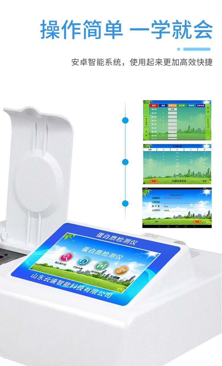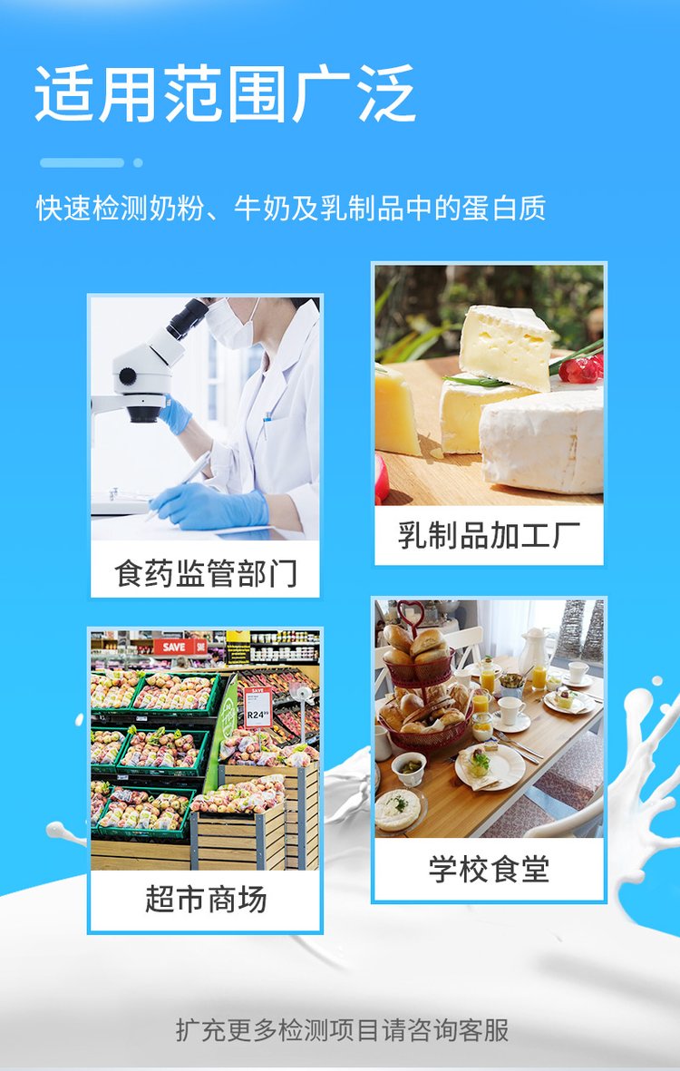 檢測項目:可快速檢測奶粉、牛奶及乳制品中的蛋白質,儀器預留其他項目檢測程序和端口,根據(jù)日后需求可方便的自主增加檢測項目。