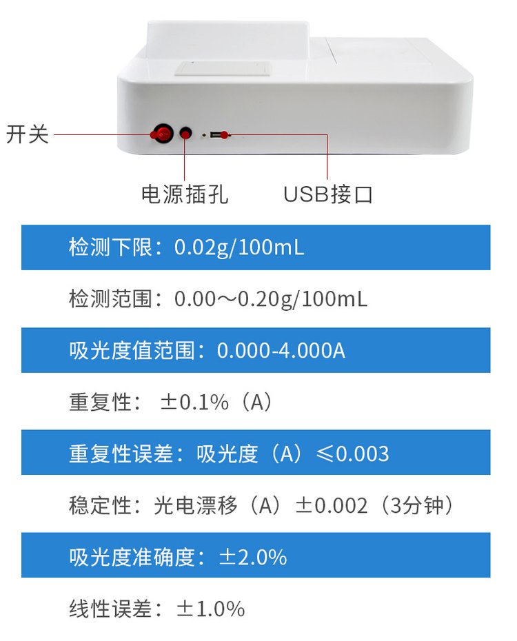 1、儀器采用臺式一體化系統(tǒng)檢測技術,將分光光度模塊、數(shù)字化管理模塊、無線通訊模塊高度集成于一體,支持檢測200種食品安全檢測項目,同時預留升級檢測方法。
