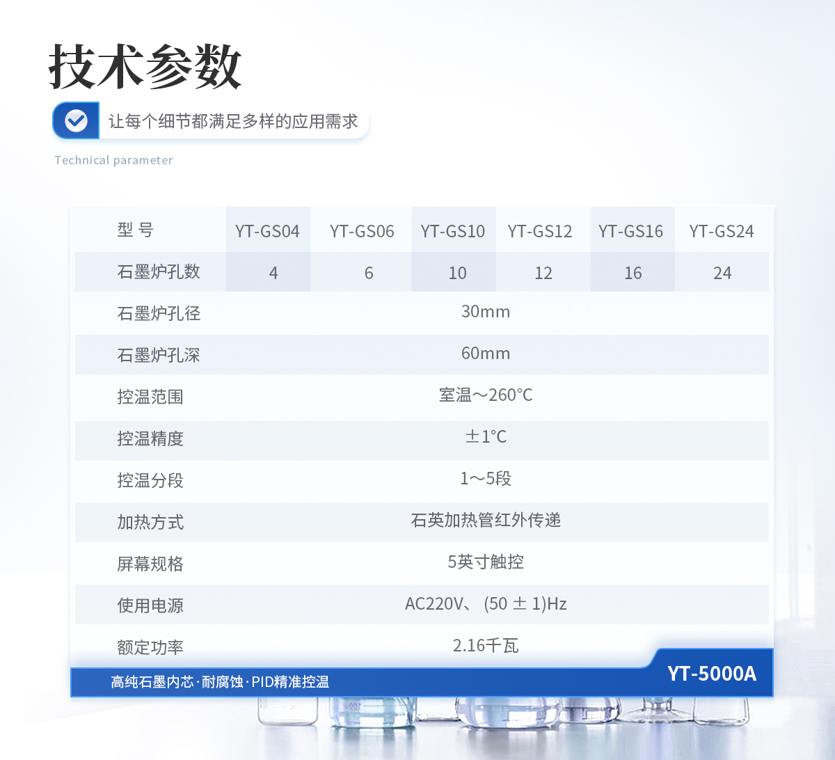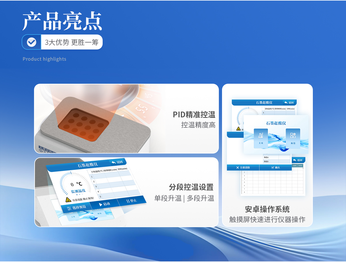 | 使用5寸彩色觸摸屏進(jìn)行儀器操作,配備安卓操作系統(tǒng),方便快捷。 | 采用PID 控溫技術(shù),控溫精度高,升溫速度快, 從室溫到260℃僅需25分鐘。 | 分段控溫設(shè)置,即可單段升溫,也可多段升溫,設(shè)置靈活,儀器將自動(dòng)按順序完成。更適于易產(chǎn)生泡沫的樣品。 | 采用優(yōu)質(zhì)石墨爐內(nèi)芯,平均溫差較小,樣品效果一致性好,熱傳導(dǎo)效率更高。石墨塊具有特氟龍涂層,耐腐蝕,延長使用壽命。 |