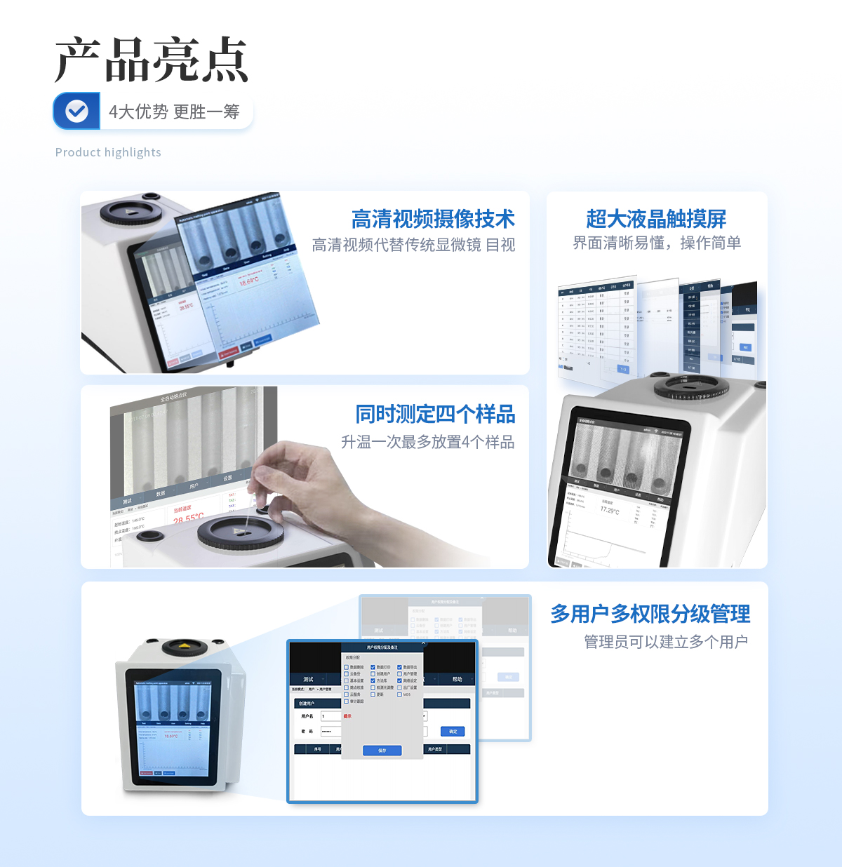 | 1、自動化集成,實現(xiàn)一鍵測定功能; | 2、一次處理4個樣品; | 3、高清視頻代替?zhèn)鹘y(tǒng)顯微鏡目視高; | 4、全自動記錄熔程,初熔,終熔; | 5、可通過打印機直接打印數(shù)據(jù); | 6、符合21CFR Part 11、審計追蹤、藥典及電子簽名; | 7、符合GLP要求規(guī)范; | 8、符合2020版藥典。 |