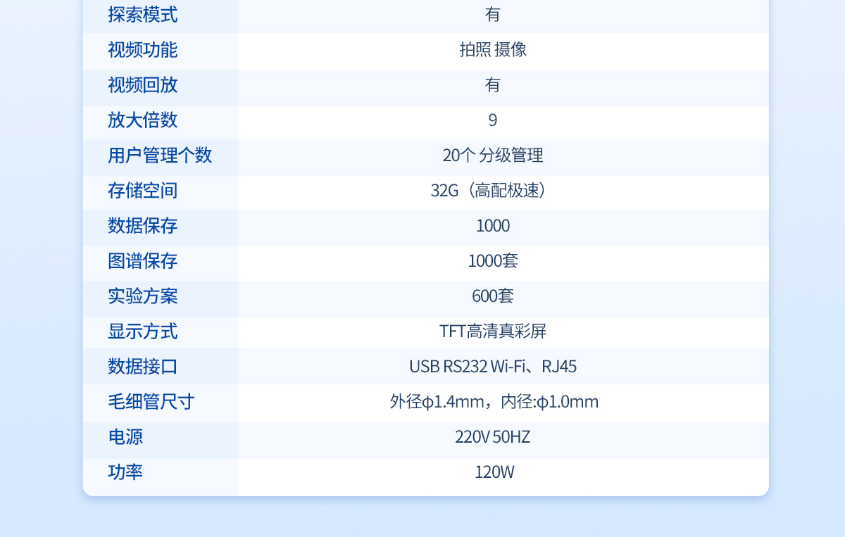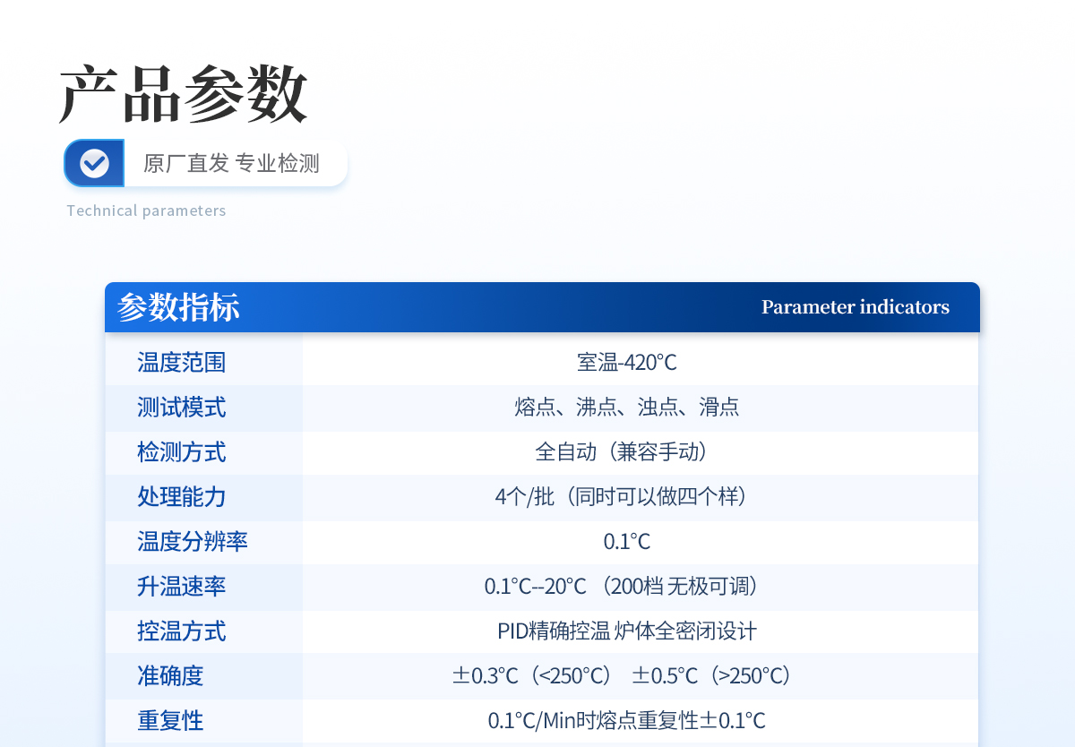 | 溫度范圍:室溫-360℃ | 檢測方式:全自動(兼容手動) | 處理能力:4個/批(同時可以做四個樣) | 判斷能力:自動判斷樣品 | 溫度分辨率:0.01℃ | 升溫速率:0.1℃--20℃ (200檔 無極可調) | 控溫方式:PID**控溫 爐體全密閉設計 | 加熱方式:電熱塊空氣加熱法 | 升溫分辨率:0.1℃ | 升溫速率:0.1℃/Min--20℃/Min | 準確度:±0.3℃(<200℃)、±0.5℃(>200℃) | 校正功能:具備 | 探索模式:有 | 視頻功能:拍照 攝像 | 視頻回放:有/有時間水印 | 高清攝像頭:觀察樣品熔融狀態(tài) | 放大倍數(shù):20倍 | 用戶管理個數(shù):400個以上 分級四級管理 | 存儲空間:32G硬盤 | 數(shù)據(jù)保存:有 | 圖譜保存:400 | 視頻保存:有 | 內(nèi)存擴展:可以 | 實驗方案:300套 | 審計追蹤:有 | 網(wǎng) 絡:無線WIFI | 顯示方式:不小于8寸高清彩屏 | 數(shù)據(jù)接口:USB | 網(wǎng)絡WiFi接口:RS232 | 數(shù)據(jù)真實性:防篡改功能 | 數(shù)據(jù)導出:可用U盤導出 | 數(shù)據(jù)輸出形式:PDF格式和EXCL數(shù)據(jù) | 數(shù)據(jù)溢出提醒:提前自動提醒 | 打印機:選配激光打印機或熱敏/針式(兼容) | 毛細管尺寸: 外徑φ1.4mm,內(nèi)徑:φ1.0mm | 電源:220V 50HZ 功率:120W |