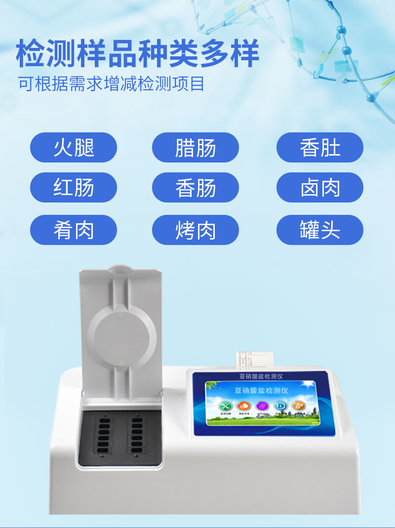 食品中亞硝酸鹽快速檢測儀為集成化食品安全檢測分析設(shè)備,能夠快速檢測肉類、肉類罐頭、熏肉、香腸、奶制品、泡菜、腌制蔬菜等中的亞硝酸鹽含量;該儀器是根據(jù)GB5009.33-2010《食品中亞硝酸鹽與硝酸鹽的測定》,食品中的亞硝酸鹽經(jīng)過提取,與檢測試劑反應(yīng)生成有色化合物,再利用亞硝酸鹽檢測儀測定其吸光度,在一定范圍內(nèi)吸光度與含量成正比。通過檢測可確定食品是否符合國家標(biāo)準(zhǔn)或是否為超標(biāo)毒害食品等。儀器預(yù)留其他項目檢測程序和端口,根據(jù)日后需求可方便的自主增加檢測項目。日后可升級為檢測水產(chǎn)品、面制品的綜合類型儀器。