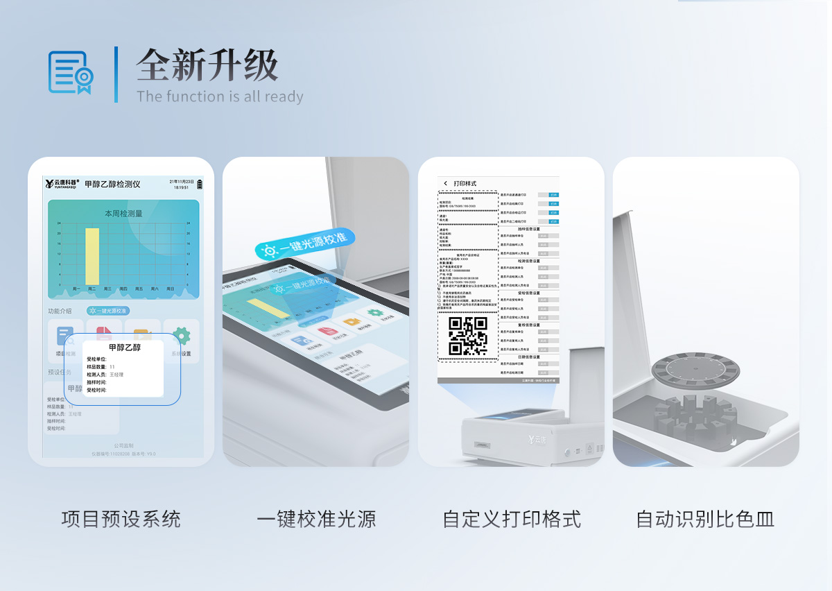 | 儀器采用臺式一體化系統(tǒng)檢測技術(shù),將分光光度模塊、新型農(nóng)殘檢測模塊、數(shù)字化管理模塊、無線通訊模塊高度集成于一體,支持檢測200種食品安全檢測項目,同時預(yù)留升級檢測方法。 | 儀器檢測模塊標(biāo)準(zhǔn)化、智能化,可隨意自由組合。檢測箱體內(nèi)置多個標(biāo)準(zhǔn)檢測單元,檢測模塊可以調(diào)整配置。 | 儀器采用全新安卓智能系統(tǒng),主控芯片采用 ARM Cortex-A7,RK3288/4核處理器,10.1寸高清液晶觸摸豎屏,更加**的UI交互界面,運轉(zhuǎn)快捷;儀器配備無線通信模塊: 4G(APN)通訊模塊、Wifi模塊,藍(lán)牙傳輸,同時具有雙USB接口以及RJ45接口能以多種方式實現(xiàn)數(shù)據(jù)保存和數(shù)據(jù)傳輸功能。 | 創(chuàng)新檢測模式: | ★檢測通道:≥12通道;采用精密旋轉(zhuǎn)比色池設(shè)計,使用同芯片同光源校準(zhǔn)精度,解決不同光源之間的誤差值。1-12通道間誤差0.1%。(**號:**202022821055.2) | ★儀器具有自動識別比色皿檢測功能,即:將樣品比色皿放入儀器后,點擊樣品檢測,儀器自動識別比色皿進(jìn)行通道檢測。 | 進(jìn)口高精光源: | 高精度進(jìn)口四波長冷光源,通道配置 410、520、590、630nm 波長光源,一個光源芯片驅(qū)動一個光源,誤差極小,每臺設(shè)備單獨**校準(zhǔn)光源,**比對,同時參照四種不同波段光源全方位覆蓋市面上99%的農(nóng)殘食品項目檢測。 | 智能化操作系統(tǒng): | 便捷操作系統(tǒng):設(shè)備檢測時可在同一檢測界面自動對應(yīng)相關(guān)檢測通道一次性選擇1-12個樣品名稱,無須退出界面,節(jié)省操作時間。 | 數(shù)據(jù)集成系統(tǒng):設(shè)備首頁自動統(tǒng)計檢測數(shù)據(jù)包含:周檢測數(shù)據(jù)、月檢測數(shù)據(jù),全部檢測總數(shù)量,均包含檢測總數(shù),合格數(shù),不合格數(shù),以及相關(guān)柱形分析圖,對各項檢測數(shù)據(jù)清晰掌握,無需電腦查詢,更加快捷直觀。 | 項目預(yù)設(shè)系統(tǒng):支持添加單個及多個相同或不相同的任務(wù)預(yù)設(shè),一鍵快速調(diào)取,每一個任務(wù)分別可以設(shè)置不同的樣品、批次、編號、來源、備注、抽樣信息、檢測信息、受檢信息、復(fù)核信息等更多信息。無縫鏈接平臺和APP實時查看下發(fā)任務(wù)。 | 數(shù)據(jù)監(jiān)管系統(tǒng):同步對接監(jiān)管平臺,數(shù)據(jù)可局域網(wǎng)和互聯(lián)網(wǎng)數(shù)據(jù)上傳,檢測結(jié)果可選擇直接傳至食品安全監(jiān)管平臺。集成OSS輸出存儲服務(wù)、區(qū)分設(shè)備定向管理應(yīng)用,進(jìn)行區(qū)域食品安全監(jiān)管及大數(shù)據(jù)分析處理與數(shù)據(jù)統(tǒng)計,檢測區(qū)域食品安全長短期動態(tài),達(dá)到食品安全問題預(yù)估、預(yù)警。 | 自定義打印系統(tǒng):內(nèi)置全新打印系統(tǒng),新創(chuàng)自定義打印方式,可按需靈活設(shè)置開啟或關(guān)閉:產(chǎn)品合格證(國家農(nóng)業(yè)部標(biāo)準(zhǔn)要求),二維碼,抽樣信息、檢測信息,受檢信息、復(fù)核信息、抽樣日期、檢測日期等信息的打印。 | 系統(tǒng)遠(yuǎn)程更新功能:可定向分客戶分儀器更新系統(tǒng),按照不同客戶后期實際需求添加項目,無需機器返廠,即可遠(yuǎn)程實時升級全新系統(tǒng),節(jié)省時間成本及避免運輸造成設(shè)備損壞。 | 儀器主機采用一體化防水、抗壓、防撞擊、防腐蝕箱體設(shè)計,同時配備交直流供電,可連接車載電源,可選配大容量充電鋰電池,滿足現(xiàn)場野外檢測需求。 | 安全證書,放心保障:儀器具有中國計量科學(xué)研究院校準(zhǔn)證書,權(quán)威認(rèn)證。 |