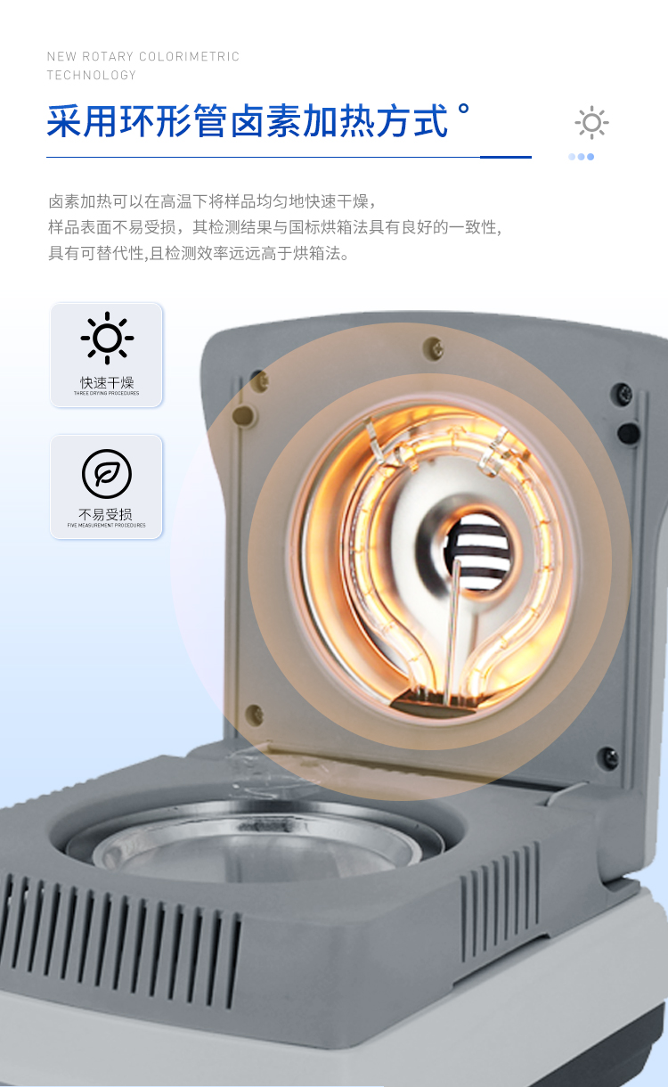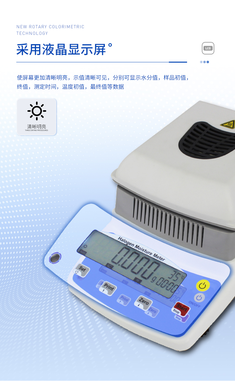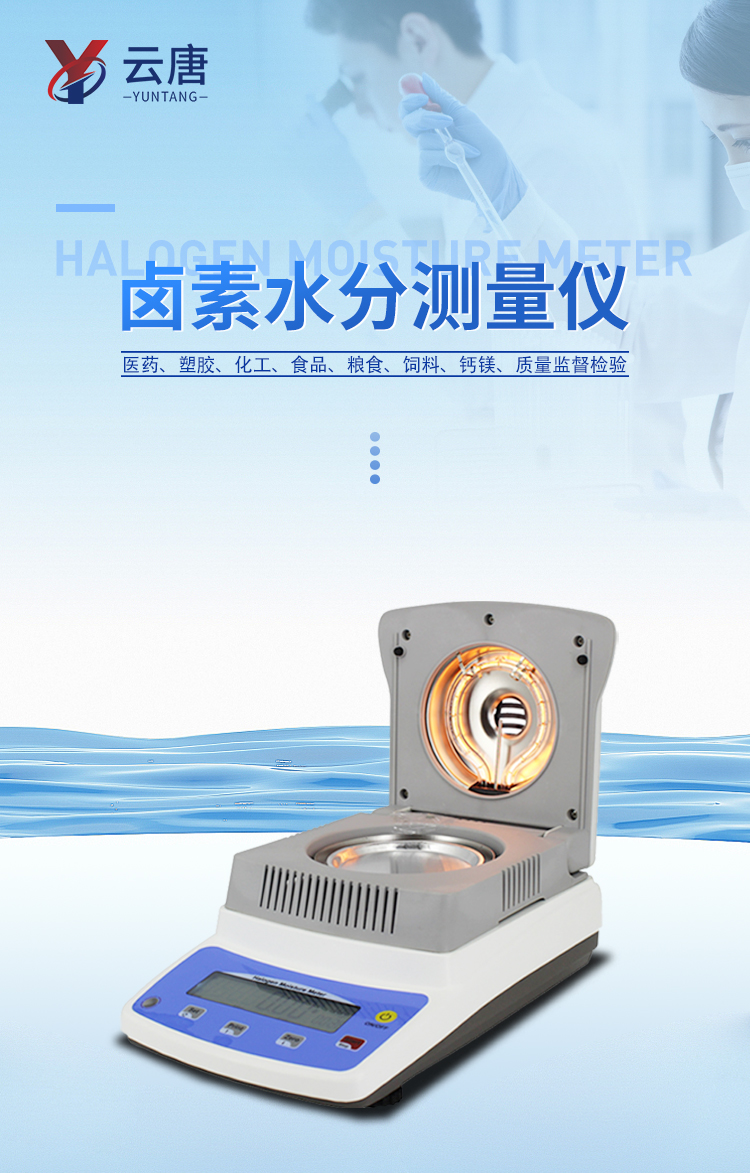 鹵素水分儀用于如:醫(yī)藥、塑膠、化工、食品、糧食、飼料、鈣鎂、質(zhì)量監(jiān)督檢驗、等各行業(yè)中的生產(chǎn)過與實驗過程中, 具有良好重現(xiàn)性的水分測定結(jié)果;清晰的按鍵和水分測定信息顯示,實現(xiàn)直觀簡單地儀器操作;創(chuàng)新的預先存儲的16種不同樣品水分測定方法數(shù)據(jù)庫,使得測試方法的開發(fā)快速、簡單