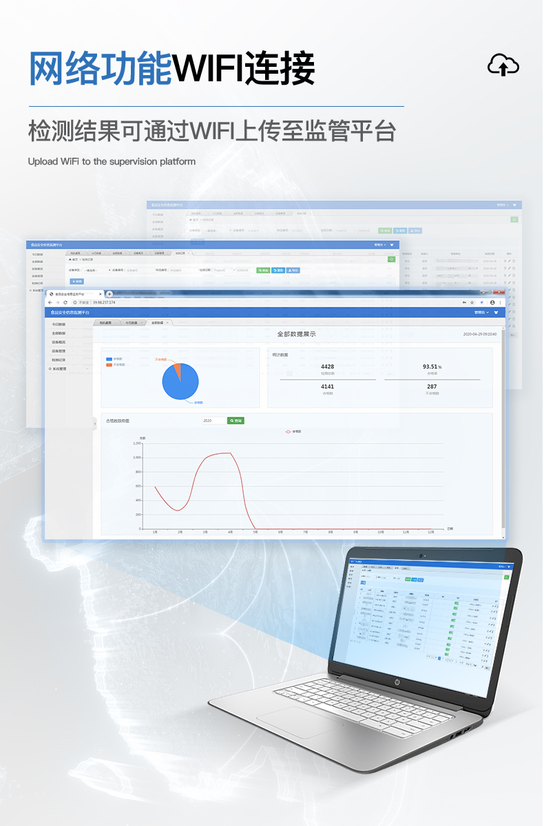 8、儀器帶有監(jiān)管平臺(tái)。數(shù)據(jù)可局域網(wǎng)和互聯(lián)網(wǎng)數(shù)據(jù)上傳,檢測(cè)結(jié)果直接傳至食品安全監(jiān)管平臺(tái)。進(jìn)行區(qū)域食品安全監(jiān)管及大數(shù)據(jù)分析處理,檢測(cè)區(qū)域食品安全長(zhǎng)短期動(dòng)態(tài),達(dá)到食品安全問題預(yù)估、預(yù)警