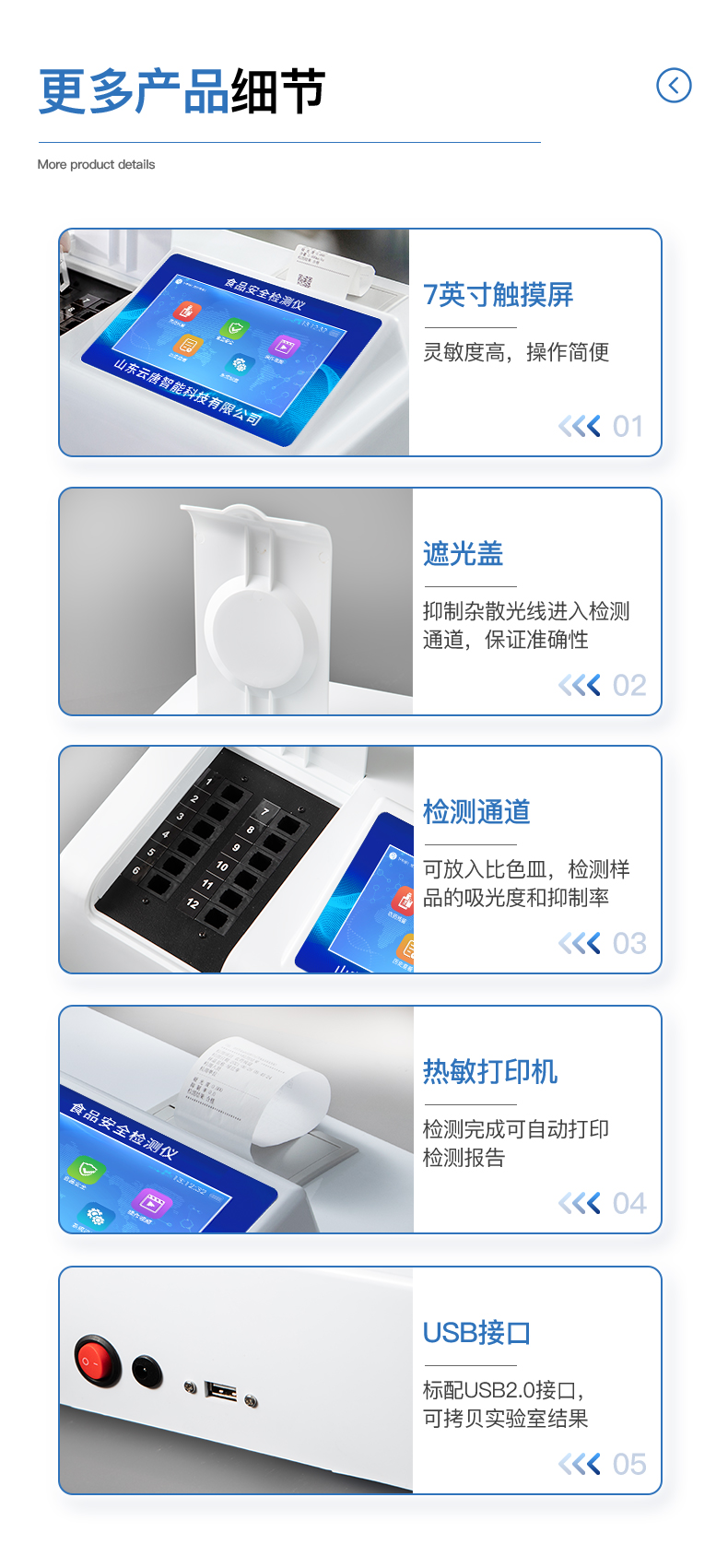 可快速檢測(cè)各類(lèi)食品中的亞硝酸鹽、二氧化硫、甲醛、吊白塊、雙氧水、硼砂、農(nóng)藥殘留、乳及乳制品中蛋白質(zhì)、硝酸鹽、重金屬鉛的含量,儀器預(yù)留其他項(xiàng)目檢測(cè)程序和端口,根據(jù)日后需求可方便的自主增加檢測(cè)項(xiàng)目。