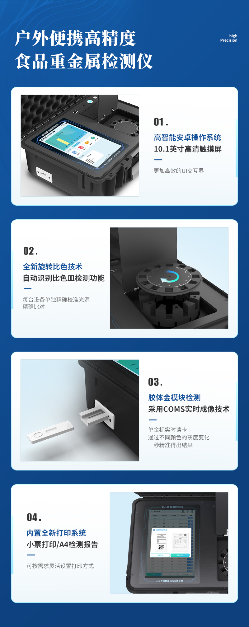 山東云唐智能科技有限公司生產(chǎn)的食品重金屬檢測儀為集成化食品安全快速檢測分析設(shè)備,采用手提箱一體化設(shè)計,重金屬檢測儀可廣泛應(yīng)用于大米、糧谷、果品、蔬菜、藥材、水產(chǎn)品中重金屬鉛、鎘、六價鉻、汞、砷、鐵、鎳、鋁的快速檢測,檢測項目可根據(jù)日后需求可進(jìn)行遠(yuǎn)程升級。