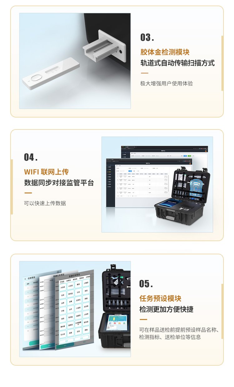 2、儀器功能包括:膠體金檢測模塊、數(shù)字化管理模塊、無線通訊模塊等,可以滿足同一軟件下實(shí)現(xiàn)所有檢測項(xiàng)目的檢測,并在同一窗口展示檢測結(jié)果。
