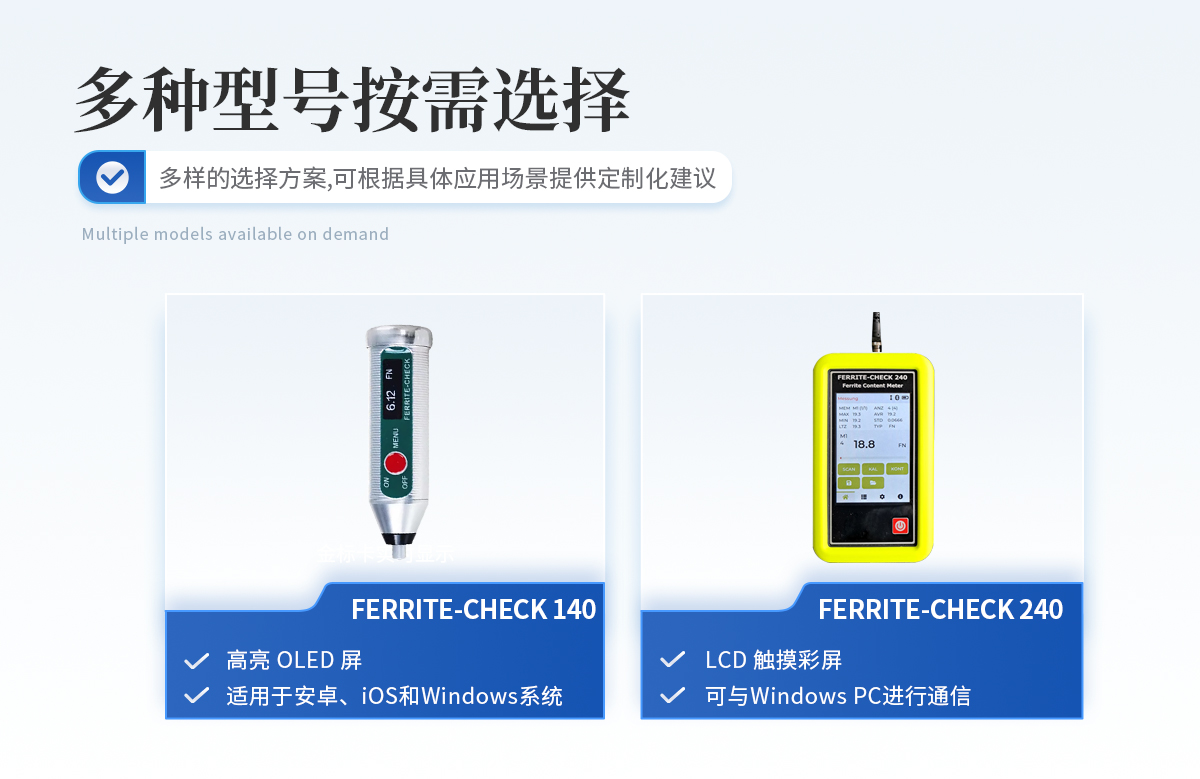 簡介:儀器介紹:鐵素體含量檢測儀Ferrite content meter;制造商:德國李斯特(List-Magnetik)性能特點:鐵素體含量檢測儀操作簡單 List-Magnetik公司 FERRITE-CHECK 140鐵素體含量檢測儀是一款設(shè)計緊湊、使用方便的便攜儀器,儀器配有集成探頭,儀器符合Basel標準DIN EN ISO 8249,使用磁感應法測量奧氏體鋼和雙相鋼中的鐵素體含