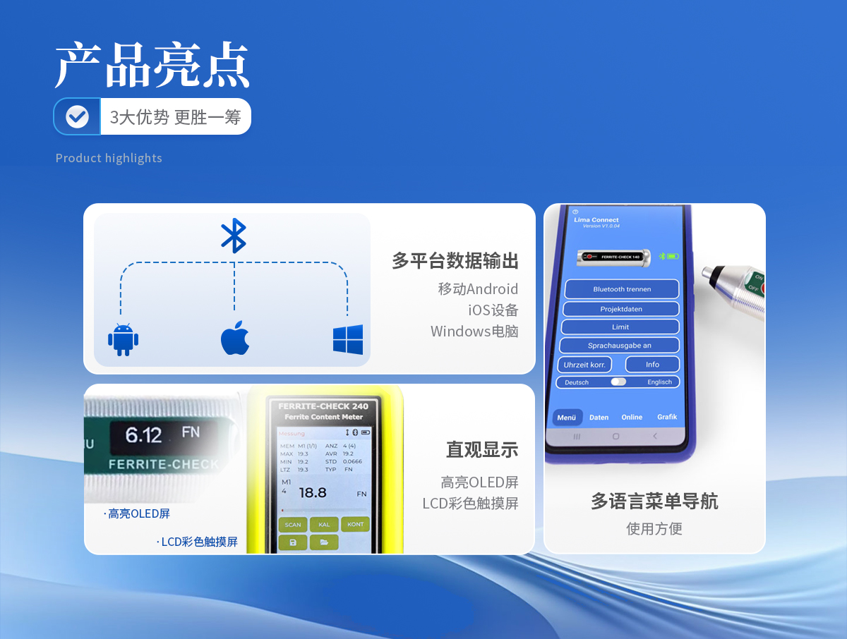 FERRITE-CHECK 240鐵素體含量檢測儀采用分體式的設(shè)計,使用方便,儀器符合Basel標(biāo)準(zhǔn)DIN EN ISO 8249,使用磁感應(yīng)法測量奧氏體鋼和雙相鋼中的鐵素體含量。 全新測頭